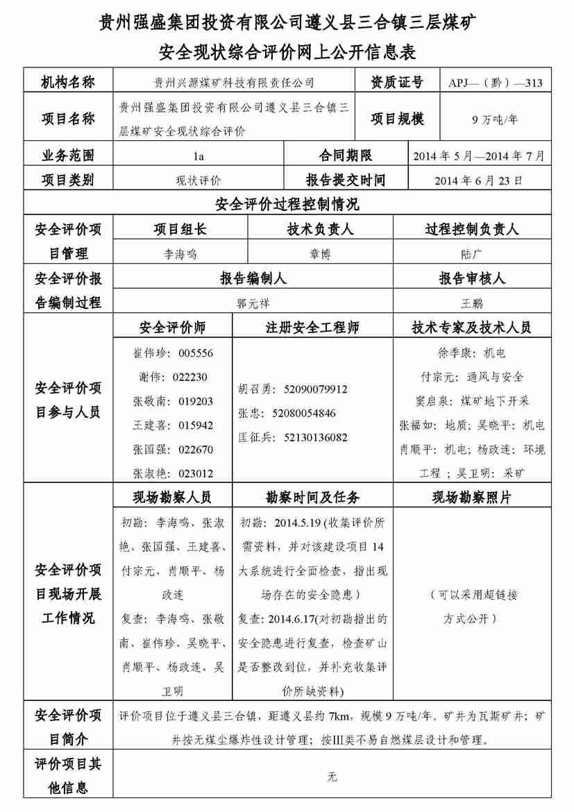貴州強(qiáng)盛集團(tuán)投資有限公司遵義縣三合鎮(zhèn)三層煤礦安全評(píng)價(jià)業(yè)務(wù)網(wǎng)上公開(kāi)信息表