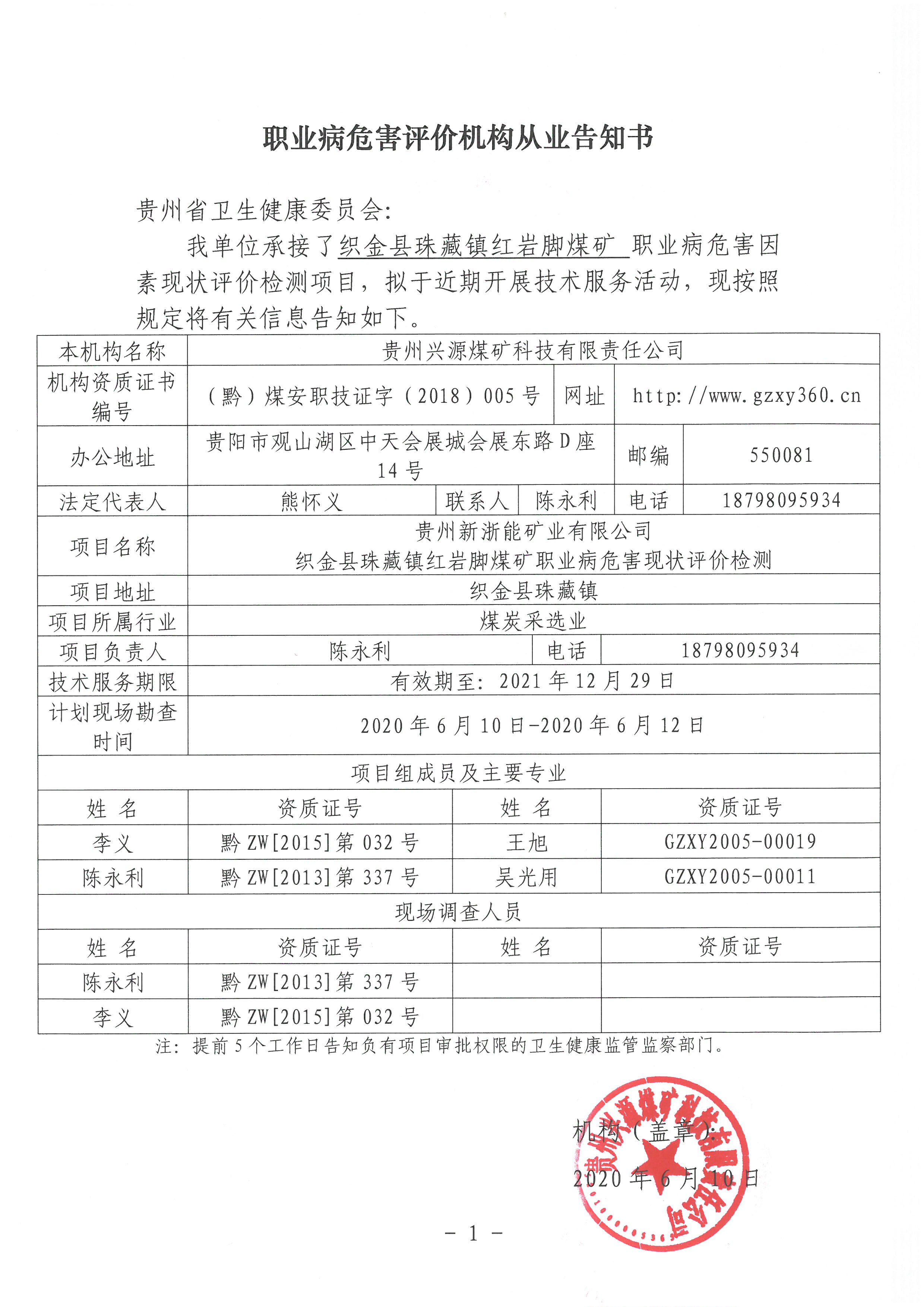 職業(yè)病危害評價機構(gòu)從業(yè)告知書[織金縣珠藏鎮(zhèn)紅巖腳煤礦]