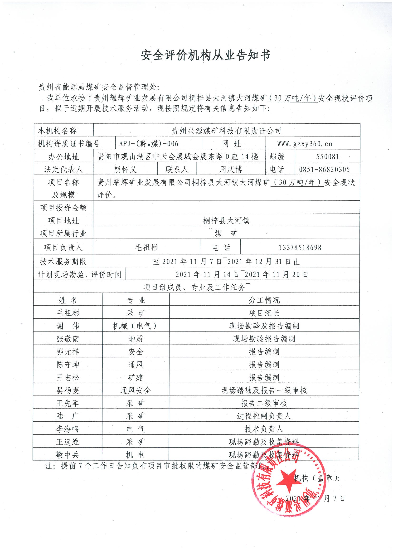 安全評價機(jī)構(gòu)從業(yè)告知書(貴州耀輝礦業(yè)發(fā)展有限公司桐梓縣大河鎮(zhèn)大河煤礦(30萬噸 /年)安全現(xiàn)狀評價)