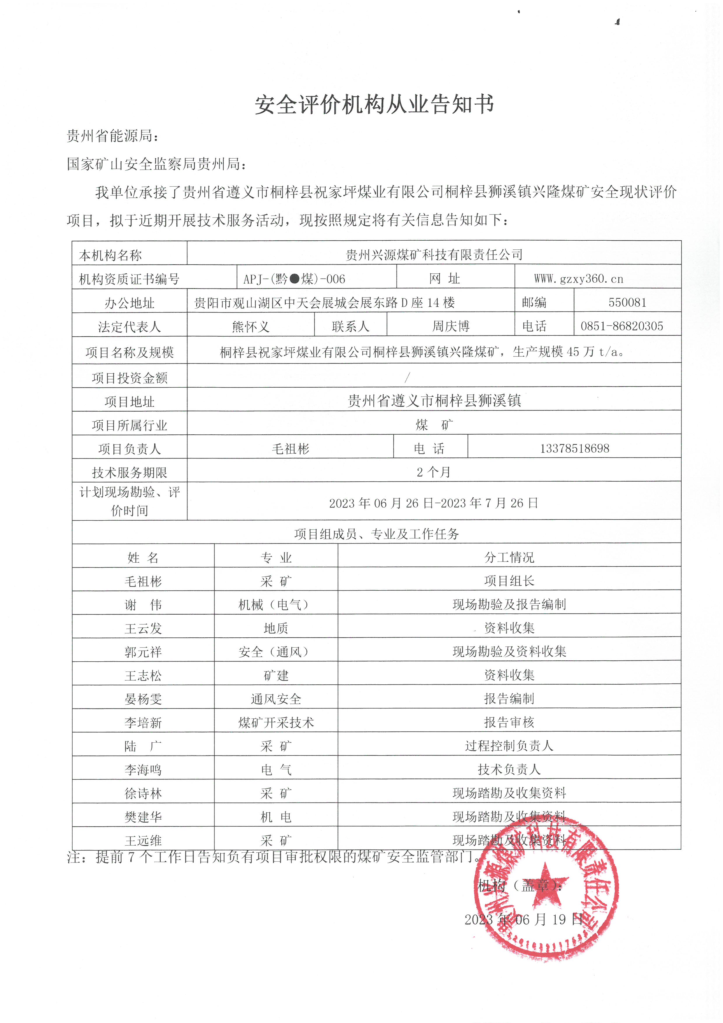 【安全評價機構(gòu)從業(yè)告知書】貴州省遵義市桐梓縣祝家坪煤業(yè)有限公司桐梓縣獅溪鎮(zhèn)興隆煤礦安全現(xiàn)狀評價