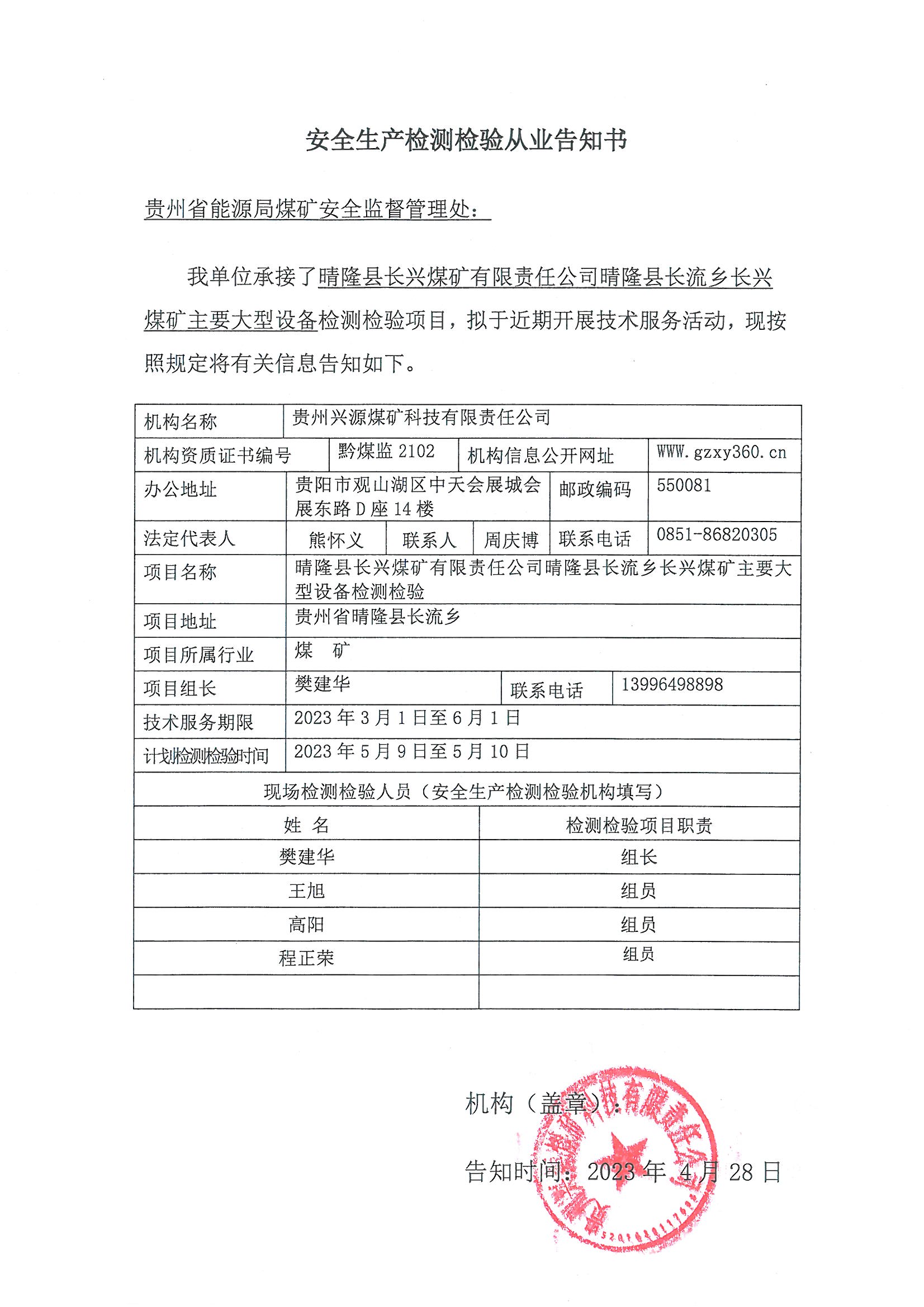 安全生產(chǎn)檢測檢驗(yàn)從業(yè)告知書【晴隆縣長興煤礦有限責(zé)任公司晴隆縣長流鄉(xiāng)長興煤礦】