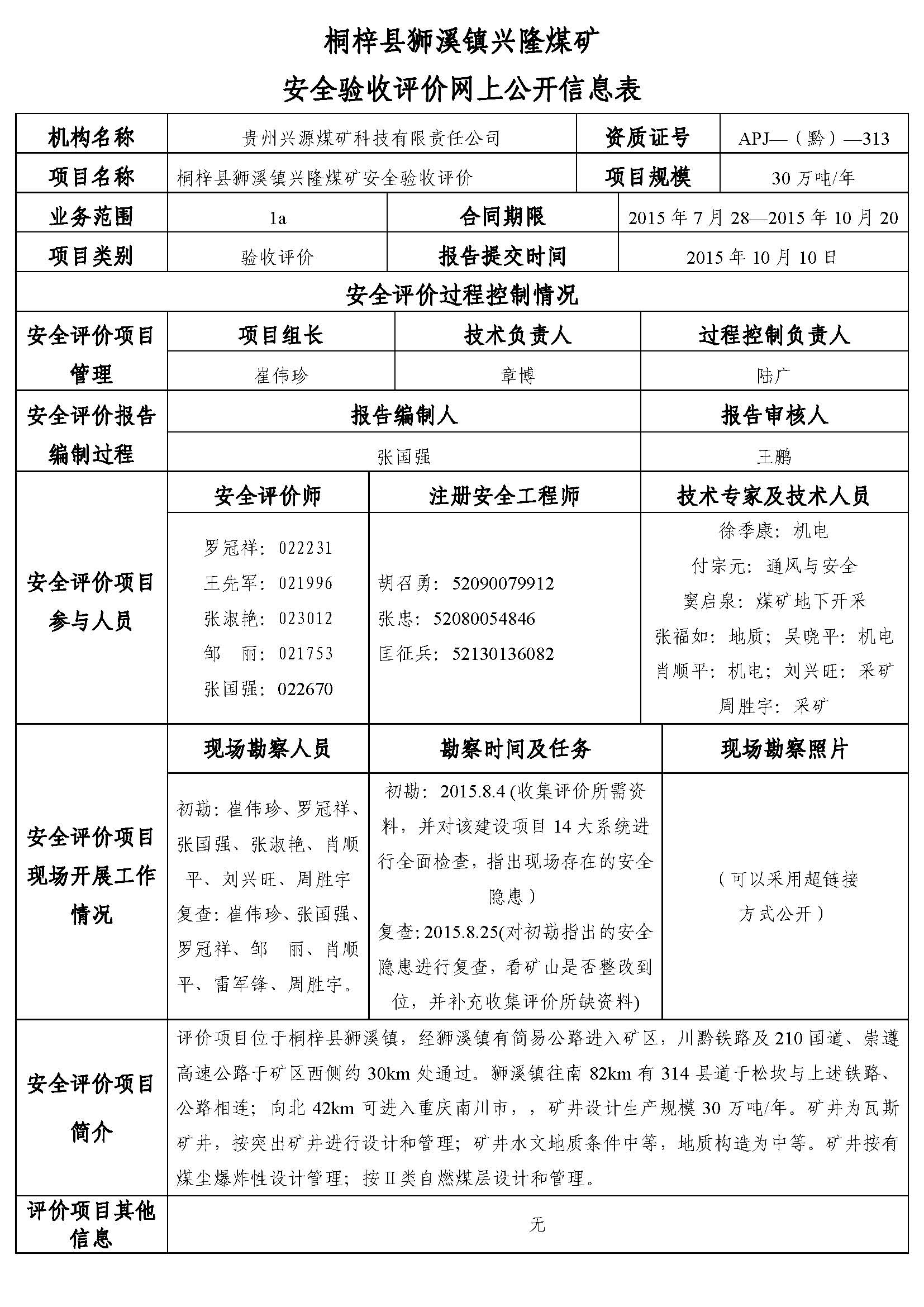 桐梓縣興隆煤礦安全評價業(yè)務(wù)網(wǎng)上公開信息表