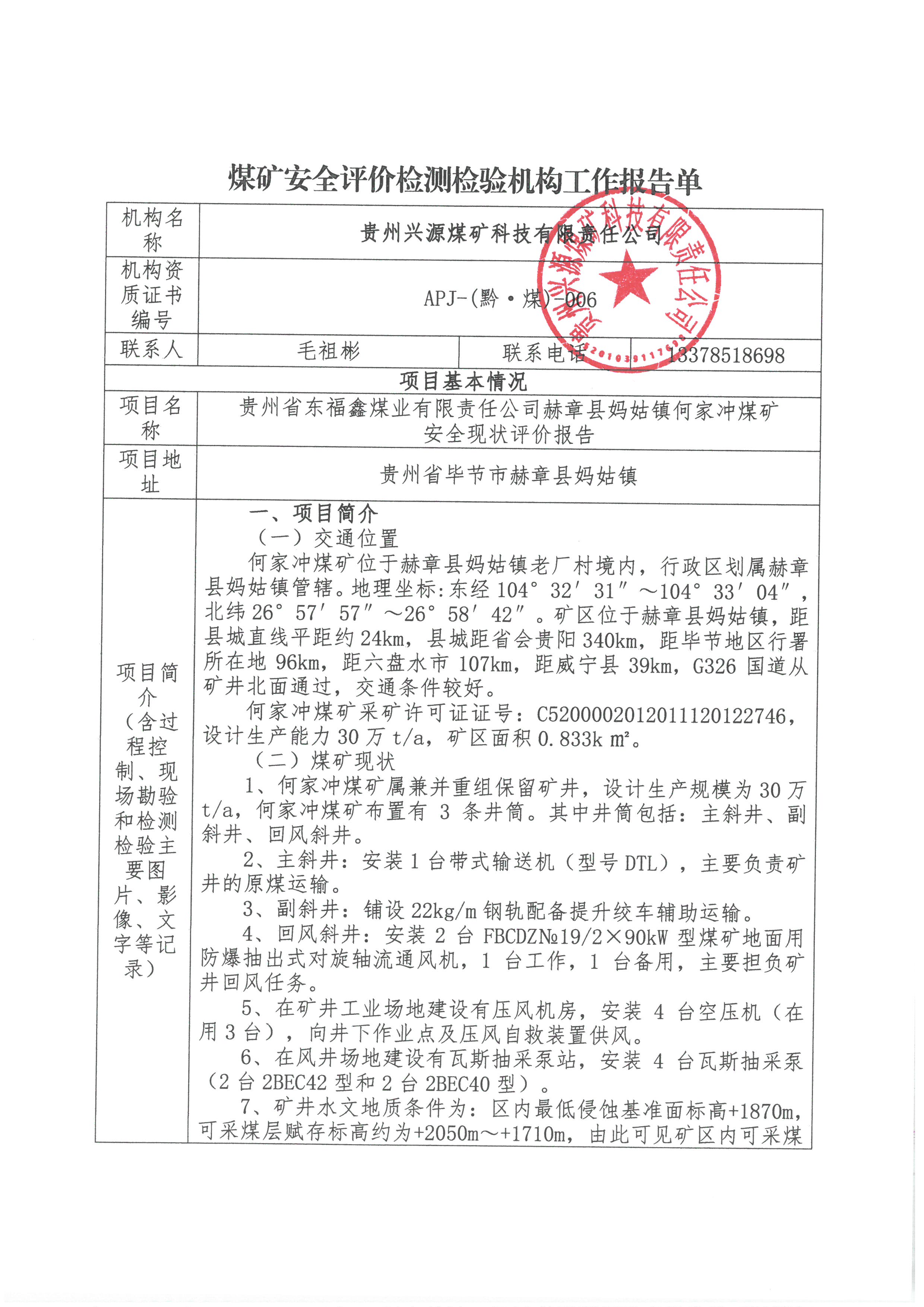 煤礦安全評(píng)價(jià)檢測(cè)檢驗(yàn)機(jī)構(gòu)工作報(bào)告單【貴州省東福鑫煤業(yè)有限責(zé)任公司赫章縣媽姑鎮(zhèn)何家沖煤礦安全現(xiàn)狀評(píng)價(jià)報(bào)告】