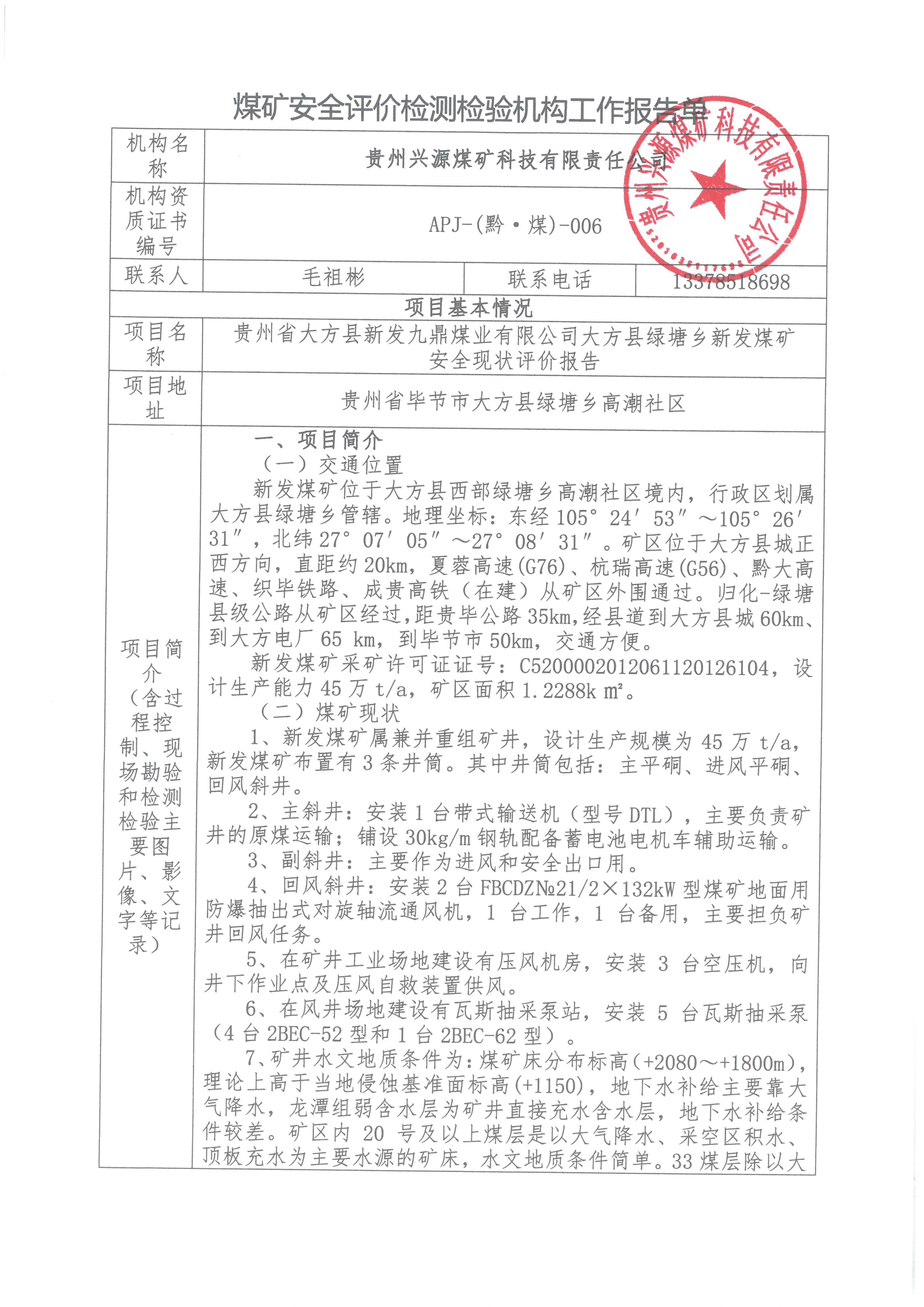 煤礦安全評價檢測檢驗機構(gòu)工作報告單【貴州省大方縣新發(fā)九鼎煤業(yè)有限公司大方縣綠塘鄉(xiāng)新發(fā)煤礦 安全現(xiàn)狀評價報告】