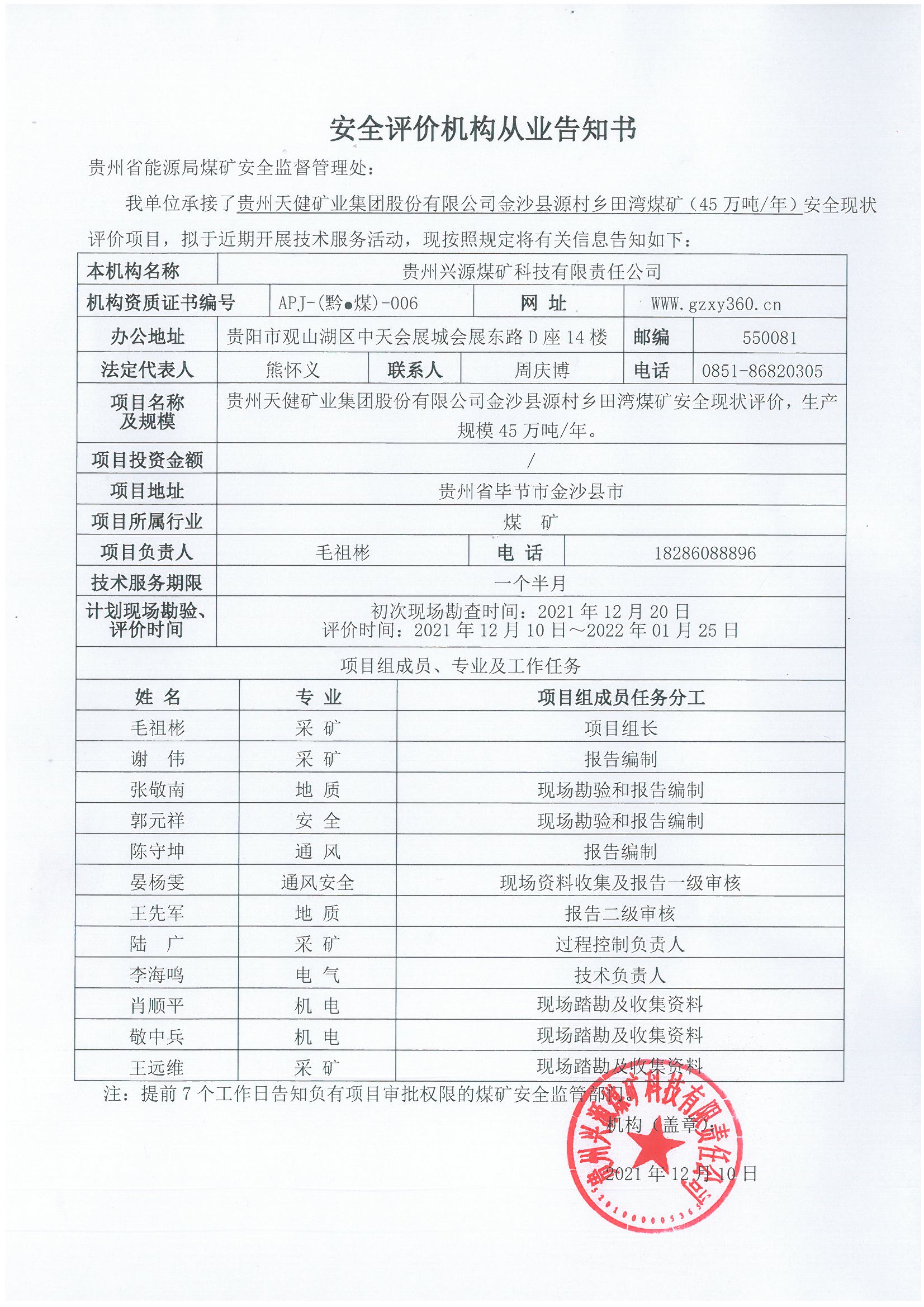 安全評價機(jī)構(gòu)從業(yè)告知書(貴州天健礦業(yè)集團(tuán)股份有限公司金沙縣源村鄉(xiāng)田灣煤礦(45萬噸/年)安全現(xiàn)狀評價)