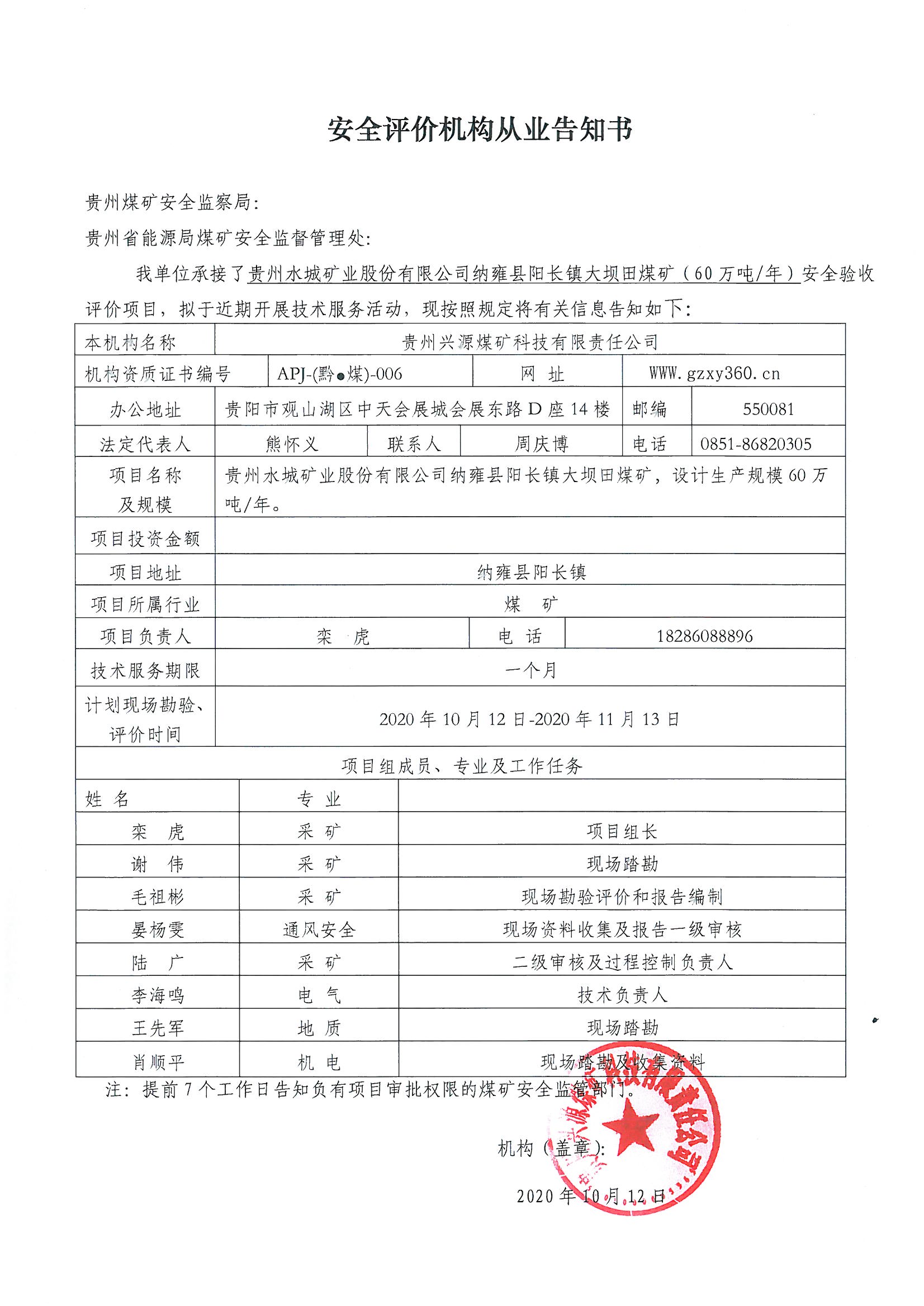 安全評(píng)價(jià)機(jī)構(gòu)從業(yè)告知書(貴州水城礦業(yè)股份有限公司納雍縣陽長鎮(zhèn)大壩田煤礦)