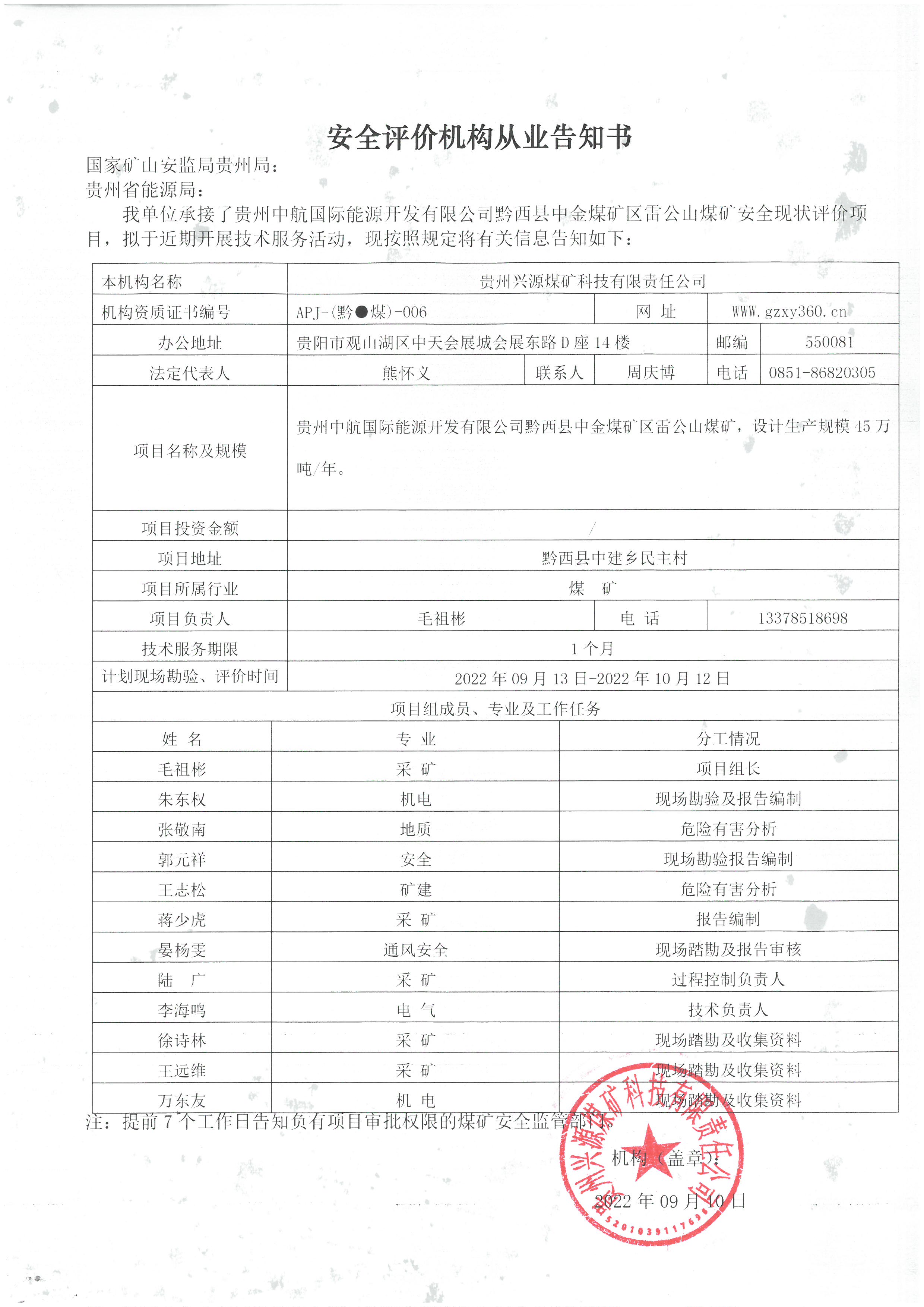安全評價機構(gòu)從業(yè)告知書(貴州中航國際能源開發(fā)有限公司黔西縣中金煤礦區(qū)雷公山煤礦安全現(xiàn)狀評價)