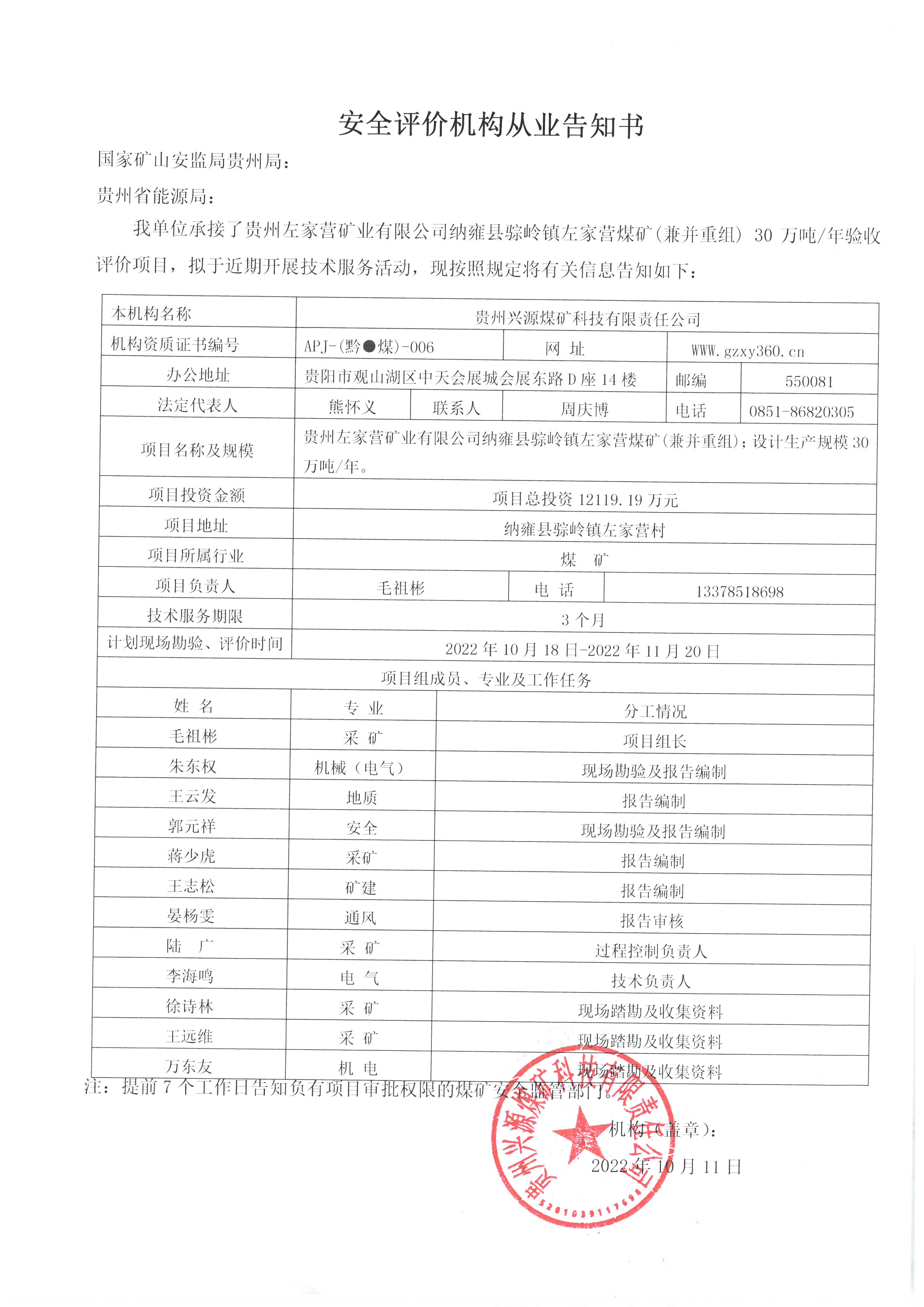 安全評價機構(gòu)從業(yè)告知書【貴州左家營礦業(yè)有限公司納雍縣骔嶺鎮(zhèn)左家營煤礦(兼并重組) 30萬噸/年驗收評價】
