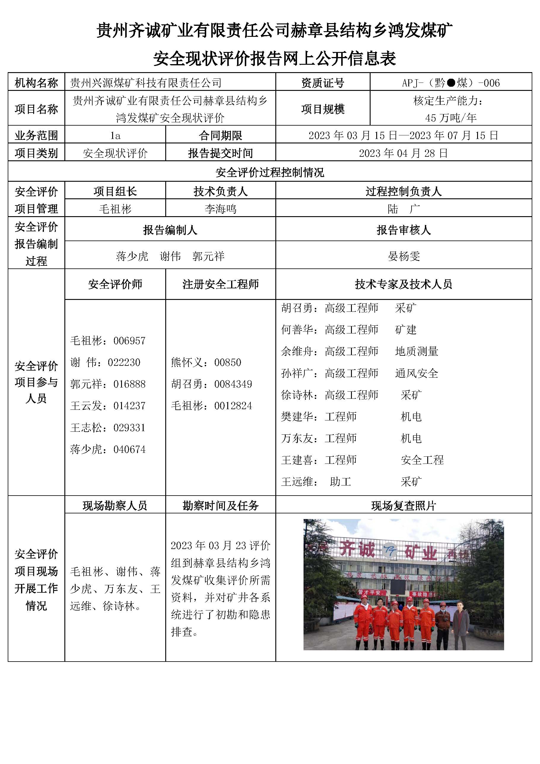 貴州齊誠礦業(yè)有限責(zé)任公司赫章縣結(jié)構(gòu)鄉(xiāng)鴻發(fā)煤礦 安全現(xiàn)狀評價報告網(wǎng)上公開信息表
