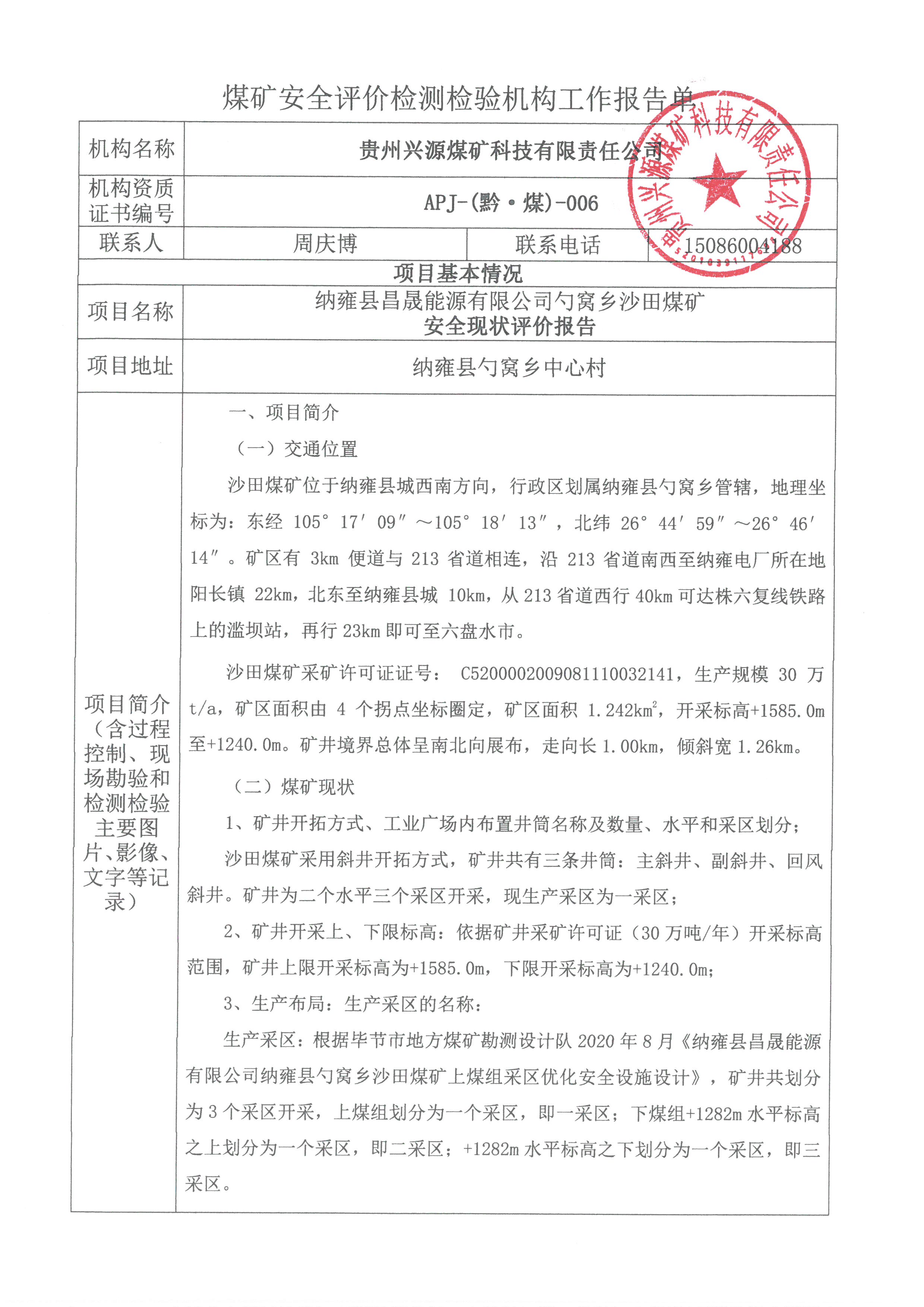 安全評價檢驗檢測機構(gòu)工作報告單【納雍縣勺窩鄉(xiāng)沙田煤礦安全現(xiàn)狀評價項目】