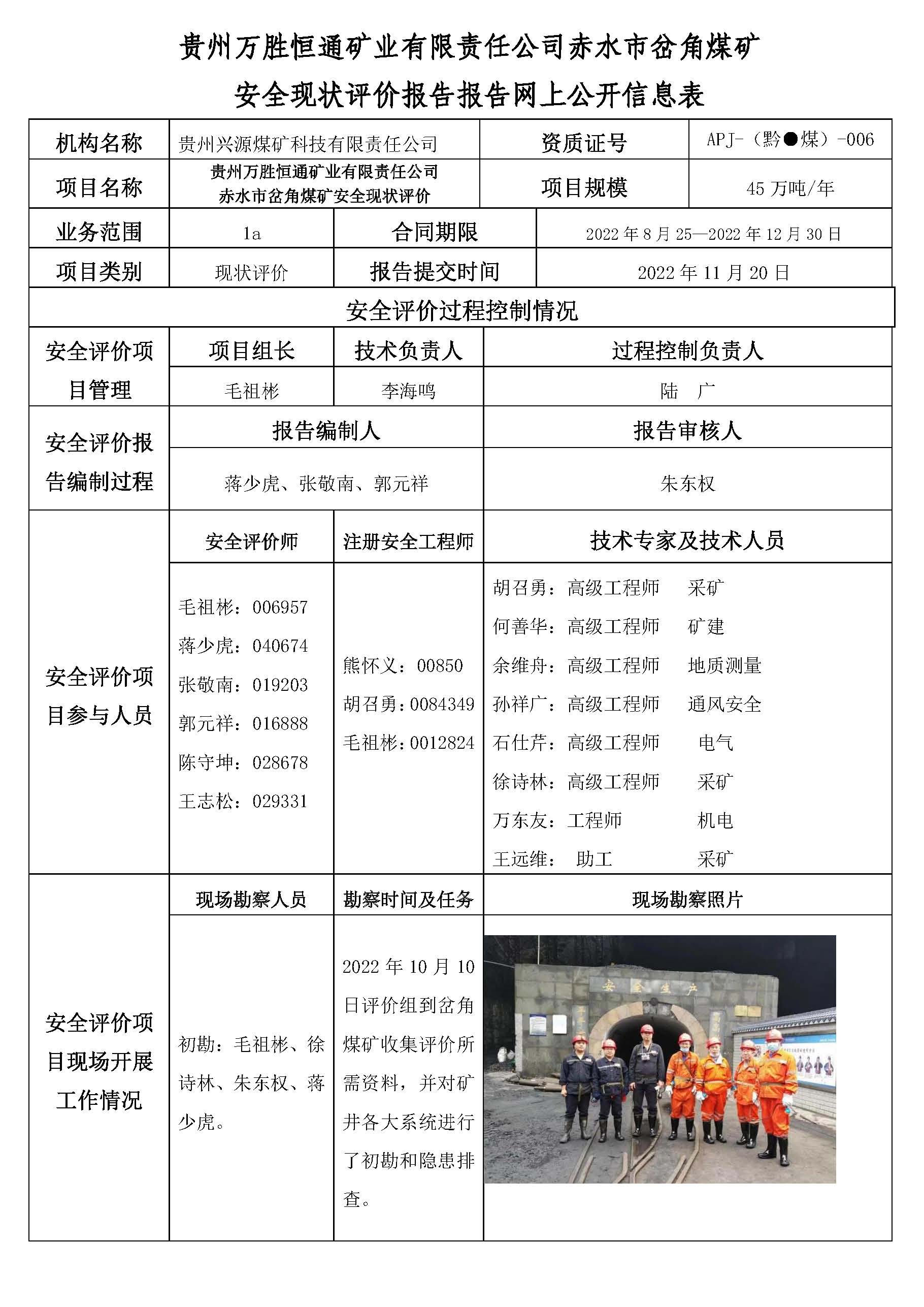 貴州萬勝恒通礦業(yè)有限責(zé)任公司赤水市岔角煤礦 安全現(xiàn)狀評(píng)價(jià)報(bào)告報(bào)告網(wǎng)上公開信息表