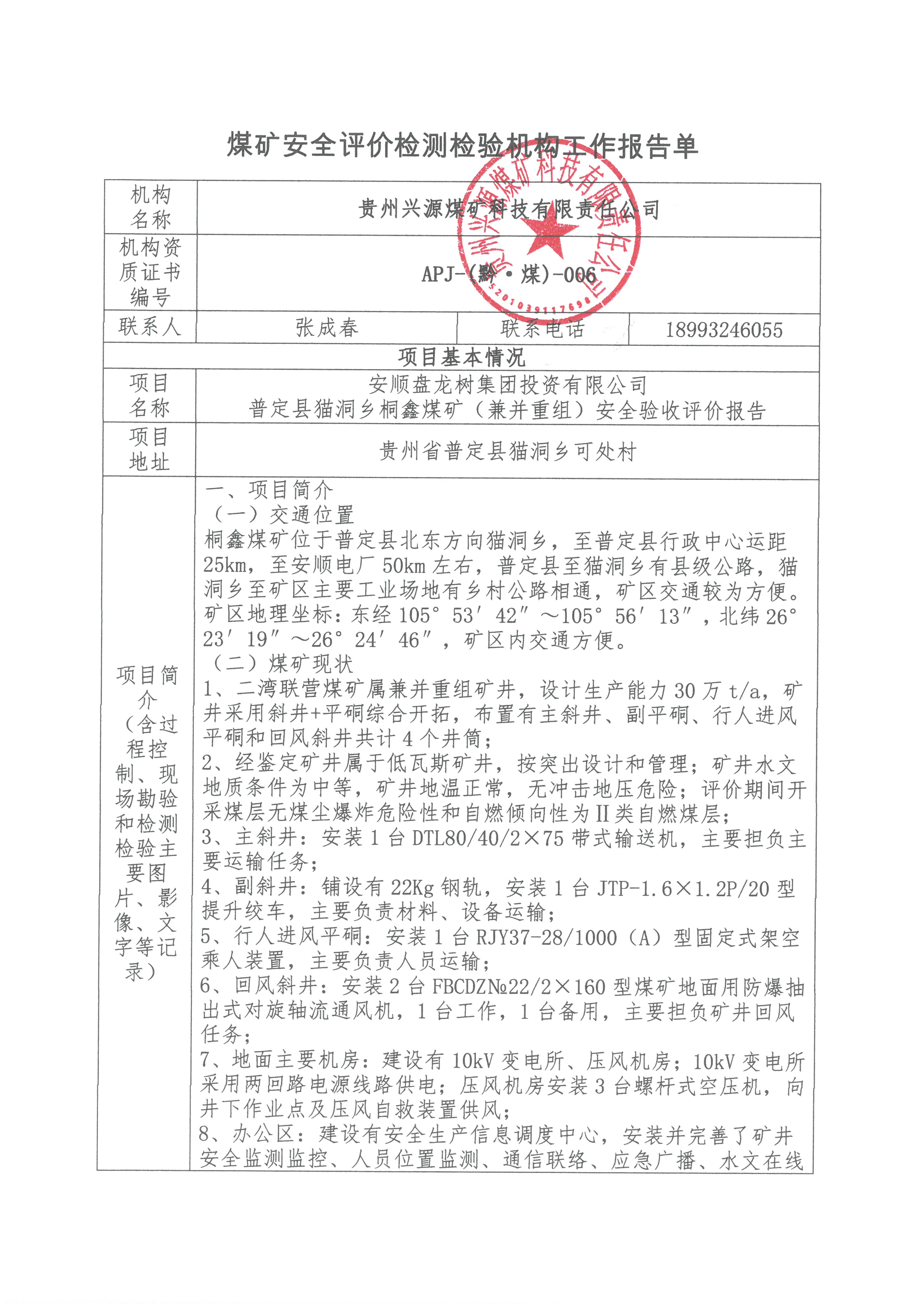 煤礦安全評價檢測檢驗機構工作報告單【安順盤龍樹集團投資有限公司普定縣貓洞鄉(xiāng)桐鑫煤礦(兼并重組)安全驗收評價報告】