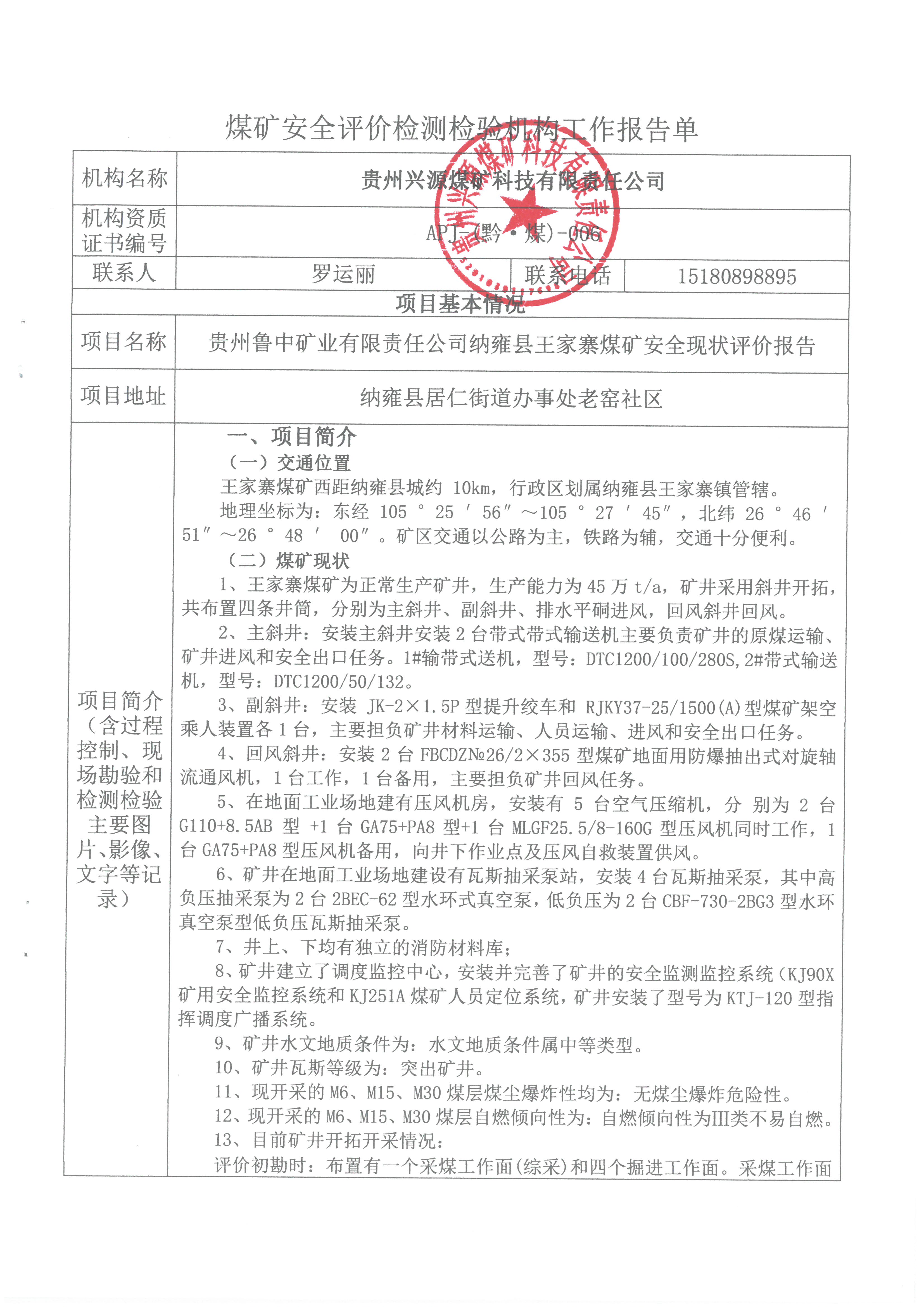 煤礦安全評價檢測檢驗機構工作報告單【貴州魯中礦業(yè)有限責任公司納雍縣王家寨煤礦安全現(xiàn)狀評價報告】
