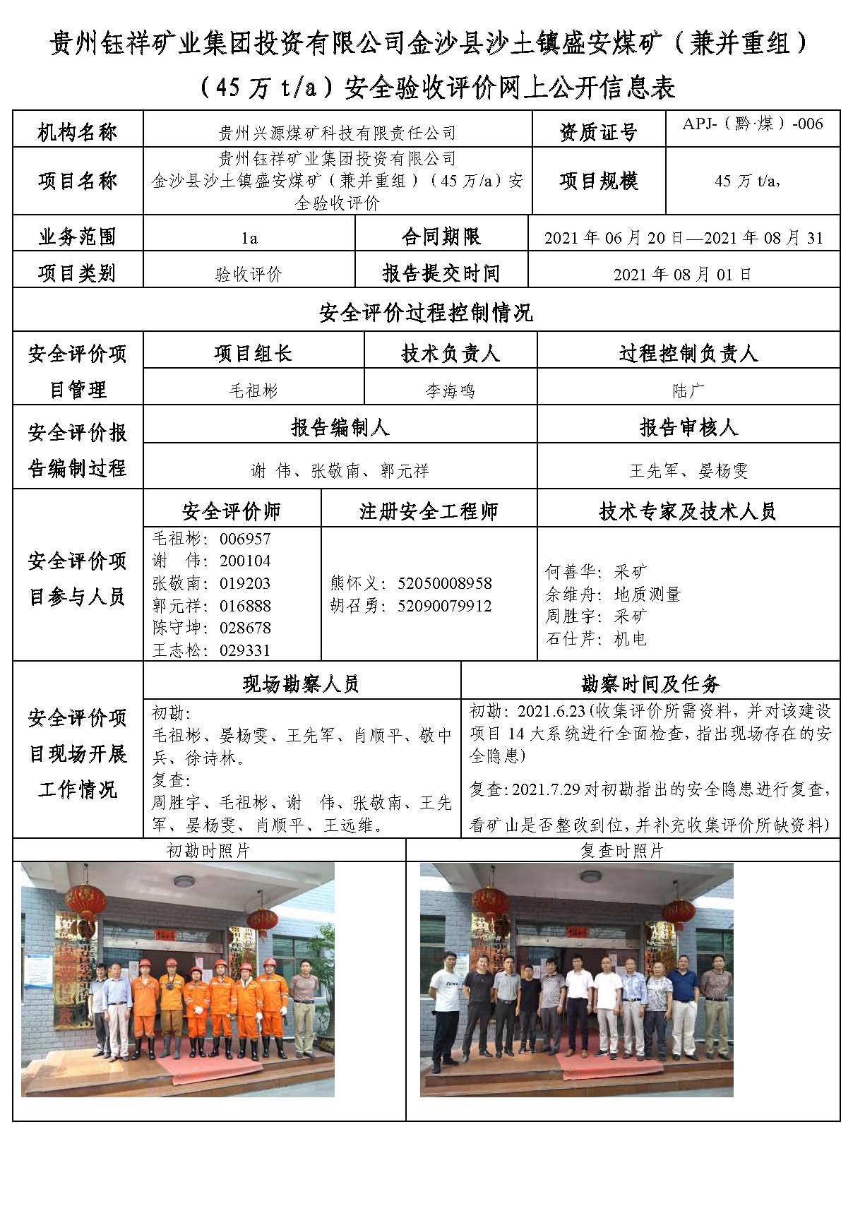 貴州鈺祥礦業(yè)集團投資有限公司金沙縣沙土鎮(zhèn)盛安煤礦(兼并重組)(45萬t/a)安全驗收評價網(wǎng)上公開信息表