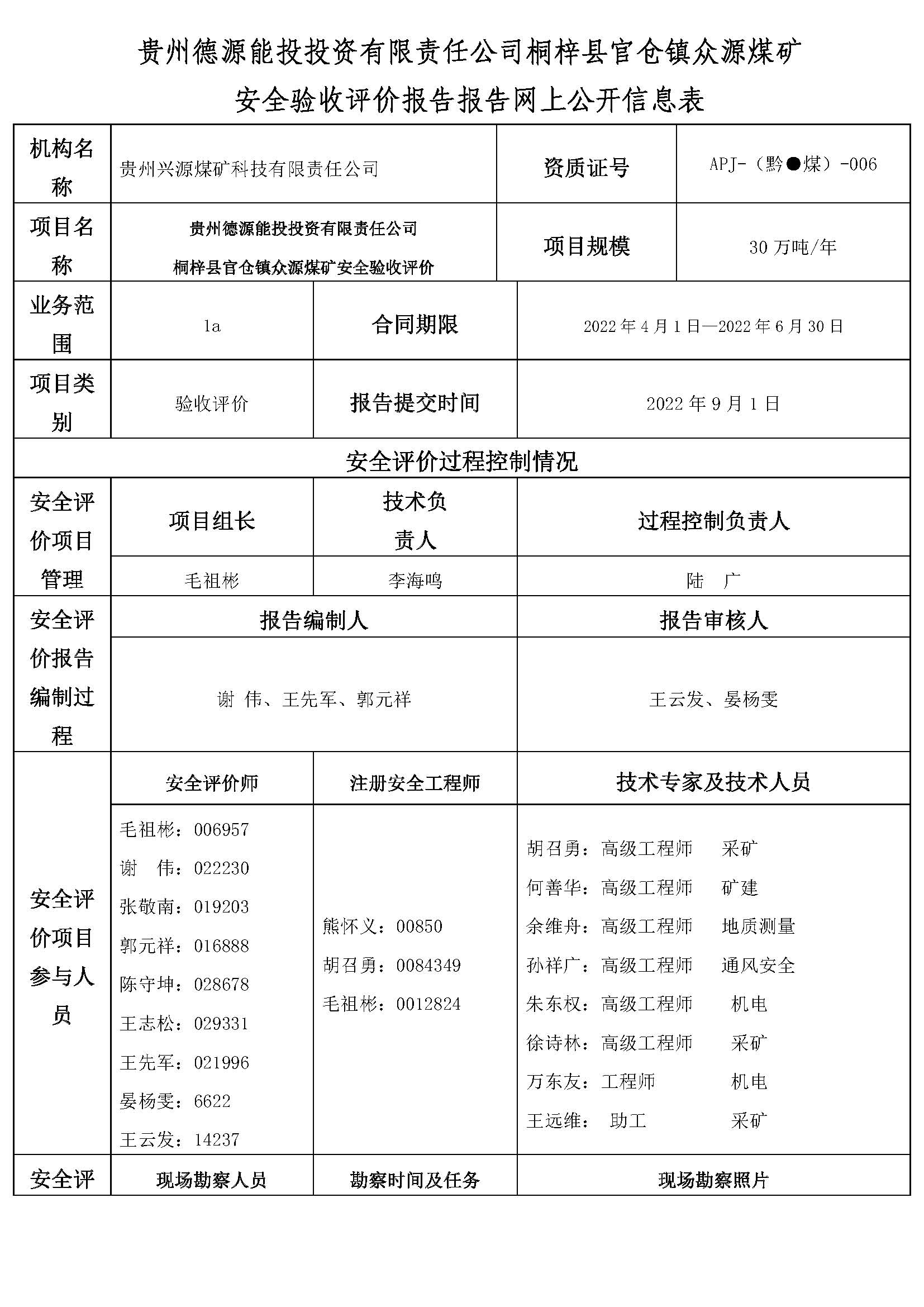 貴州德源能投投資有限責(zé)任公司桐梓縣官倉鎮(zhèn)眾源煤礦安全驗收評價報告報告網(wǎng)上公開信息表