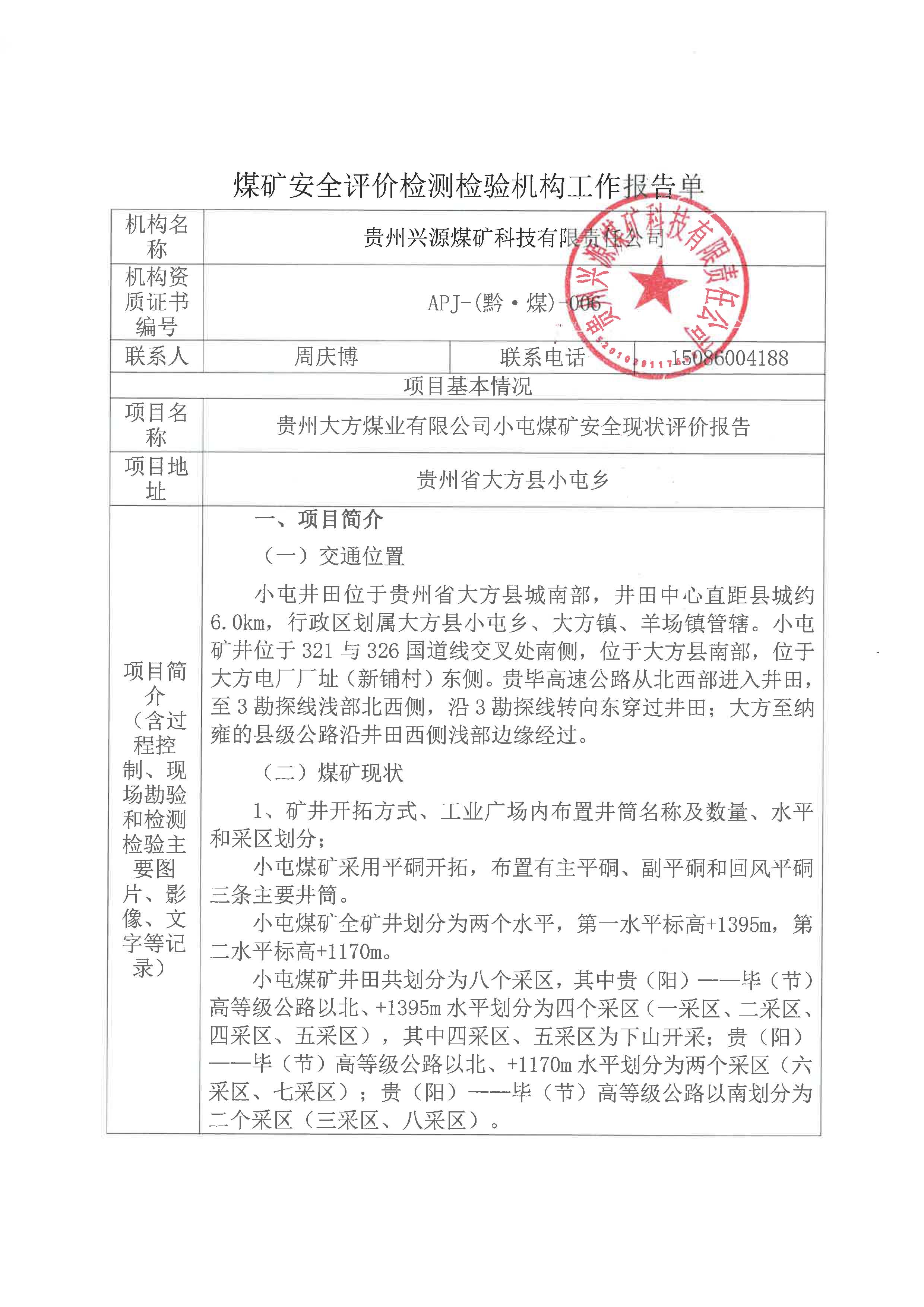 煤礦安全評價檢測檢驗機(jī)構(gòu)工作報告單【貴州大方煤業(yè)有限公司小屯煤礦安全現(xiàn)狀評價報告】