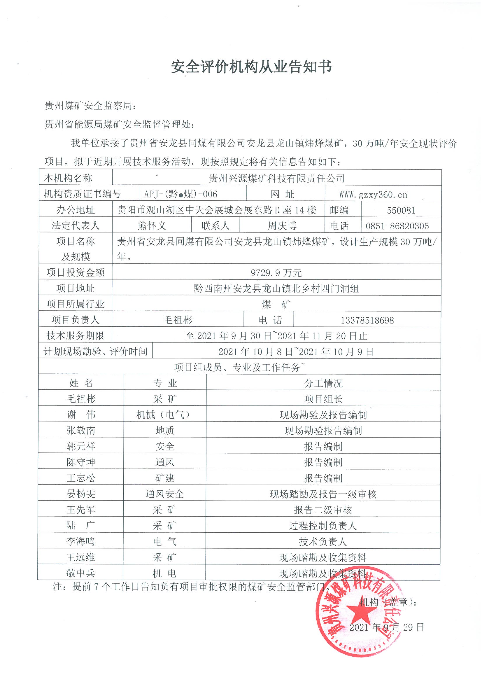 安全評價機構(gòu)從業(yè)告知書(貴州省安龍縣同煤有限公司安龍縣龍山鎮(zhèn)煒烽煤礦)