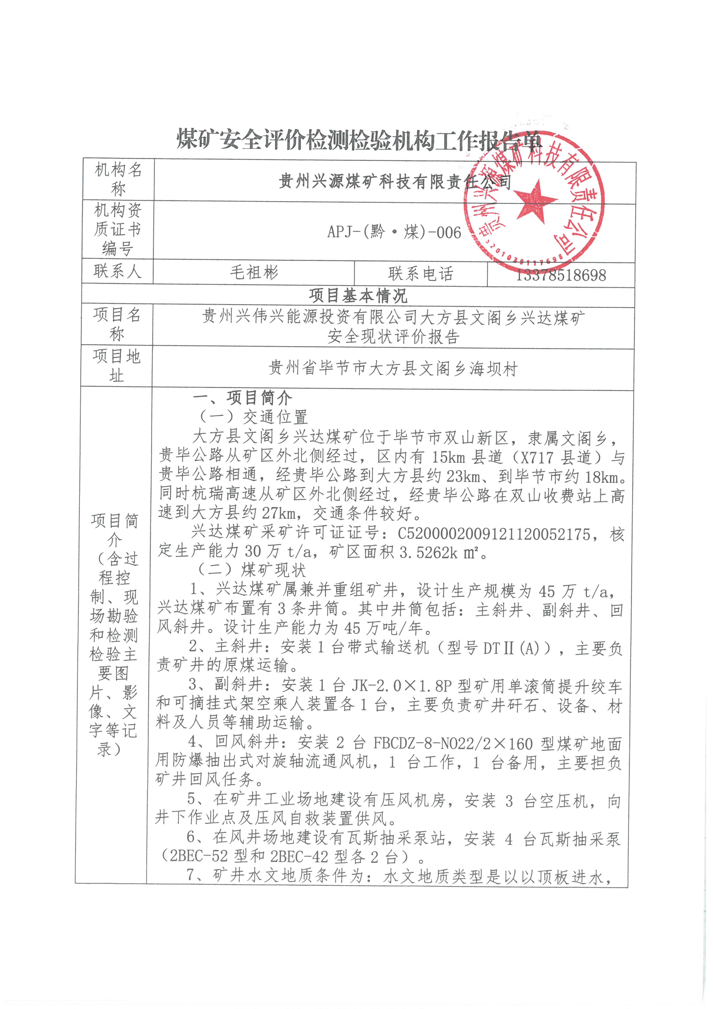 煤礦安全評價檢測檢驗機構(gòu)工作報告單【貴州興偉興能源投資有限公司大方縣文閣鄉(xiāng)興達煤礦安全現(xiàn)狀評價報告】