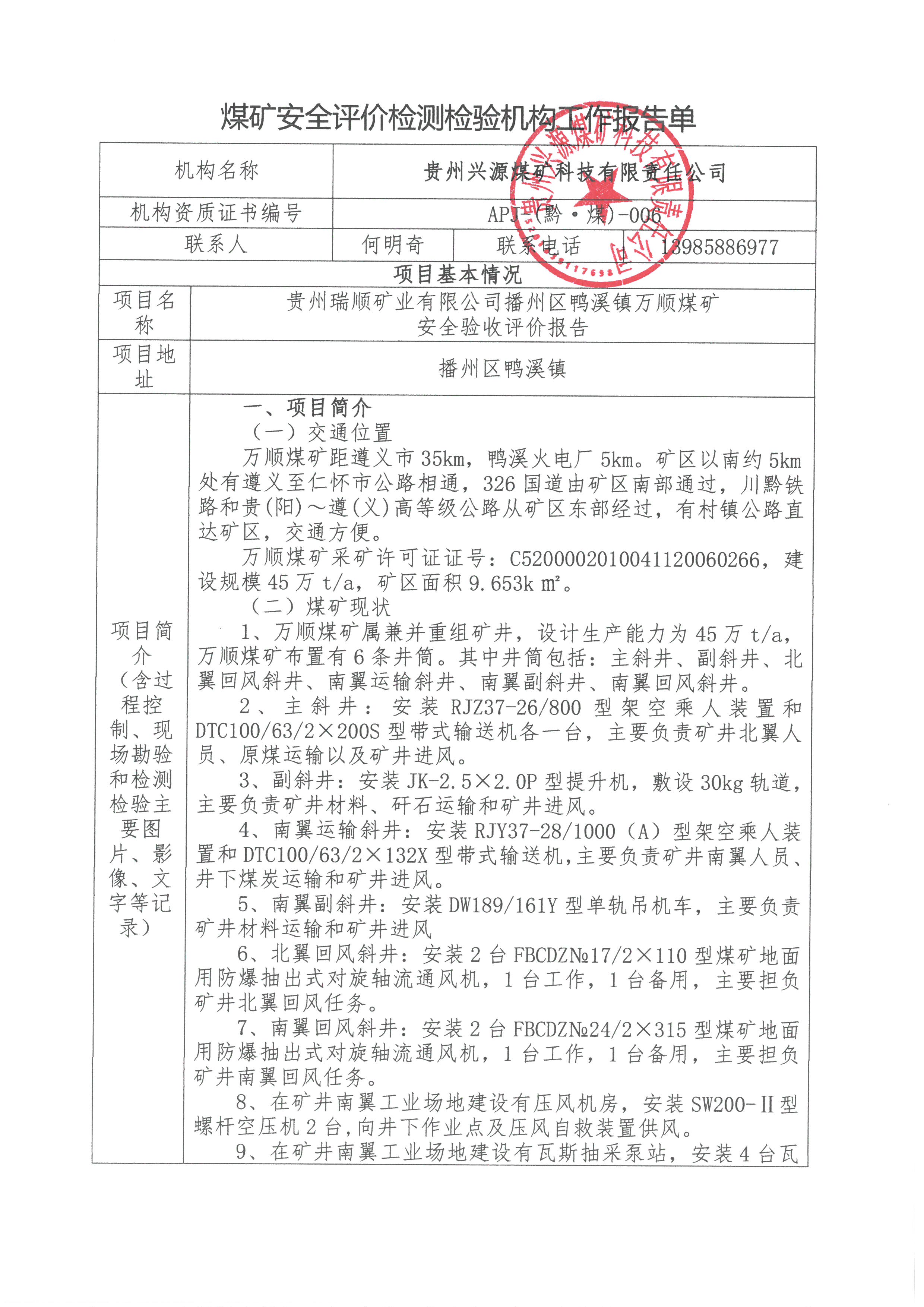 煤礦安全評價檢測檢驗(yàn)機(jī)構(gòu)工作報告單【貴州瑞順礦業(yè)有限公司播州區(qū)鴨溪鎮(zhèn)萬順煤礦安全驗(yàn)收評價報告】