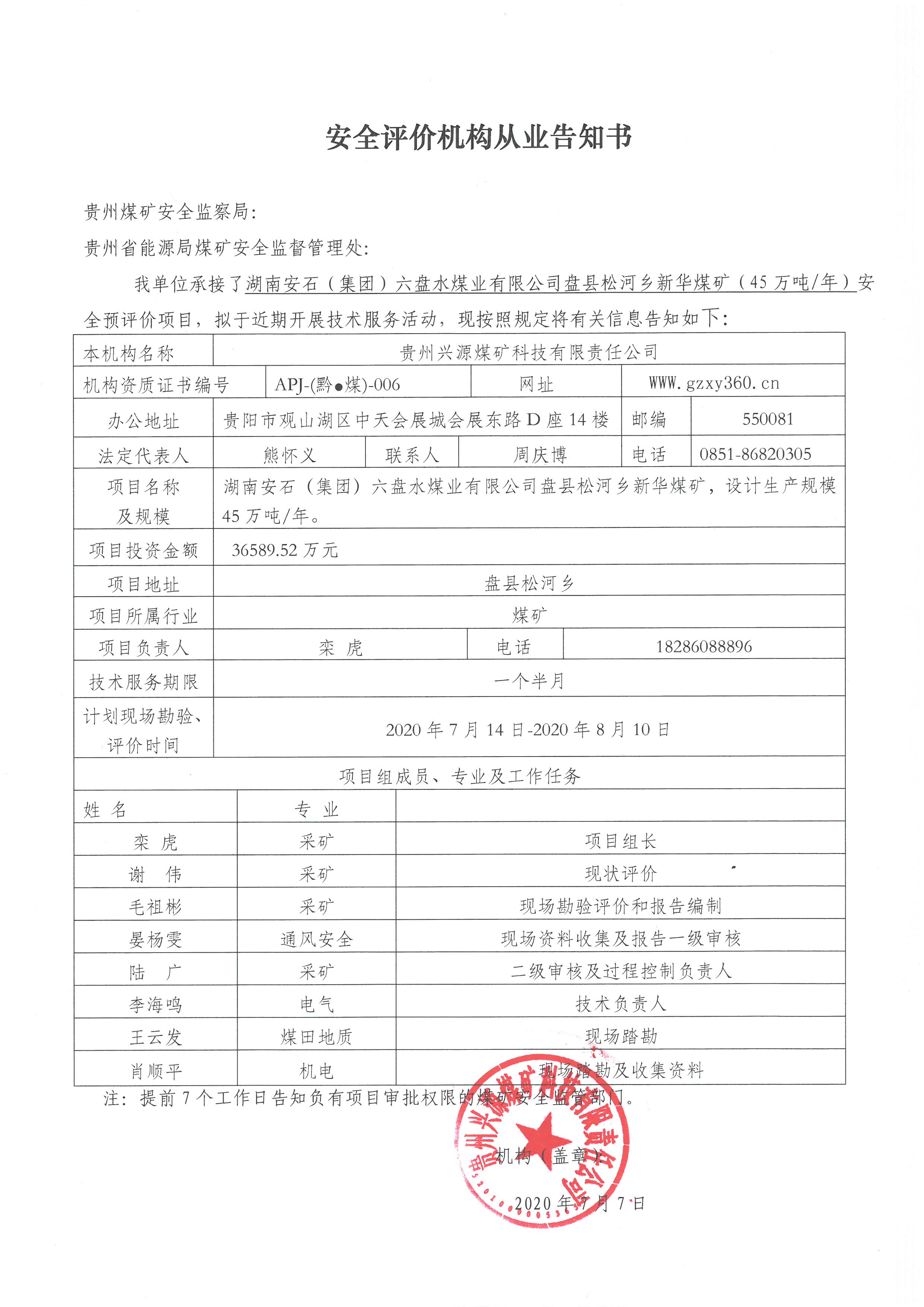 安全評價機(jī)構(gòu)從業(yè)告知書【 湖南安石(集團(tuán))六盤水煤業(yè)有限公司盤縣松河鄉(xiāng)新華煤礦】