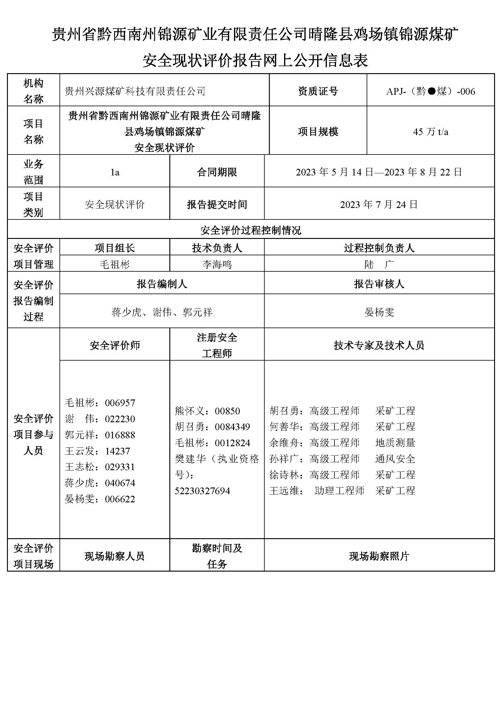 貴州省黔西南州錦源礦業(yè)有限責(zé)任公司晴隆縣雞場鎮(zhèn)錦源煤礦 安全現(xiàn)狀評價報告網(wǎng)上公開信息表