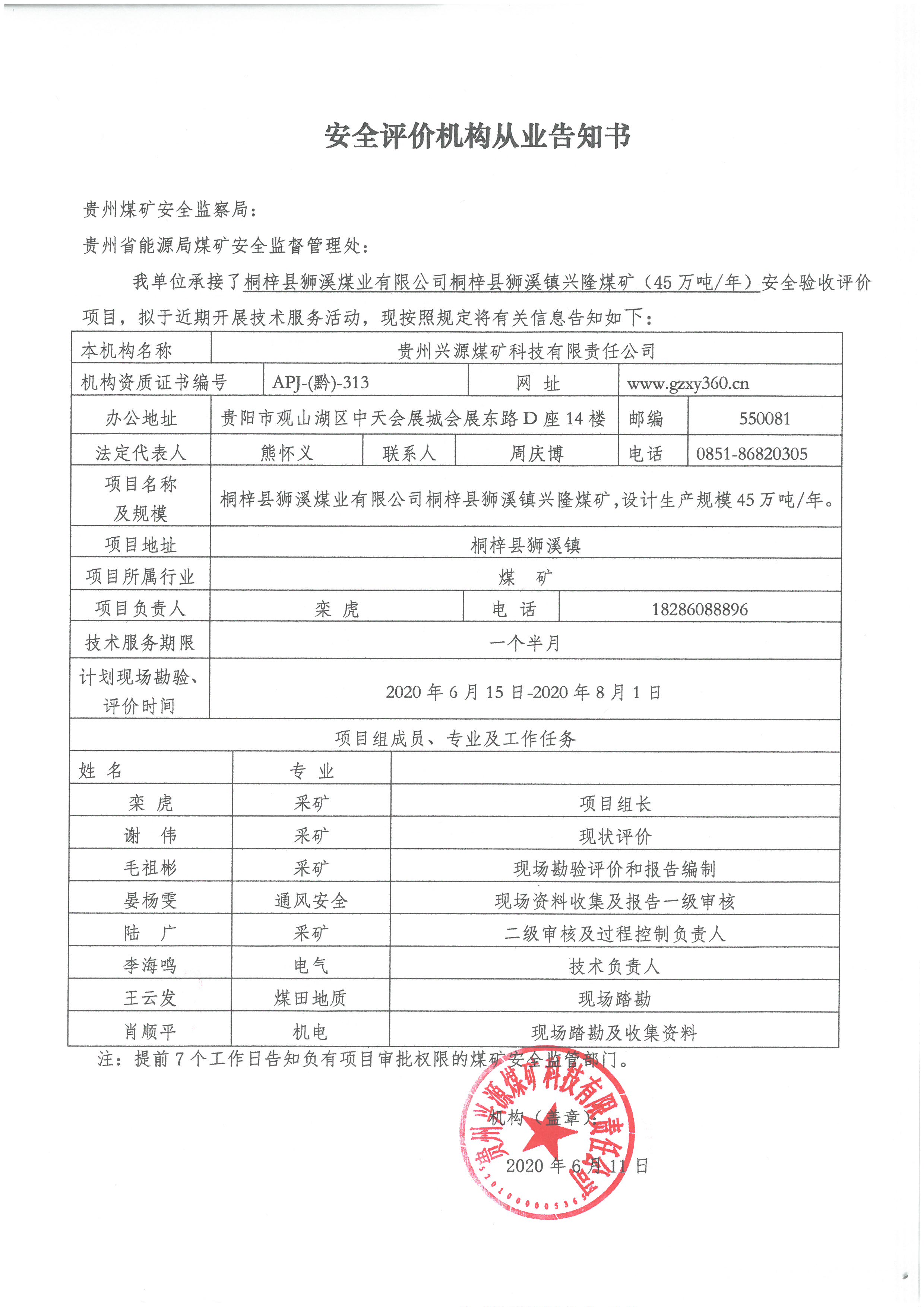 安全評(píng)價(jià)機(jī)構(gòu)從業(yè)告知書(shū)【桐梓縣獅溪煤業(yè)有限公司桐梓縣獅溪鎮(zhèn)興隆煤礦(45萬(wàn)噸/年)安全驗(yàn)收評(píng)價(jià)】