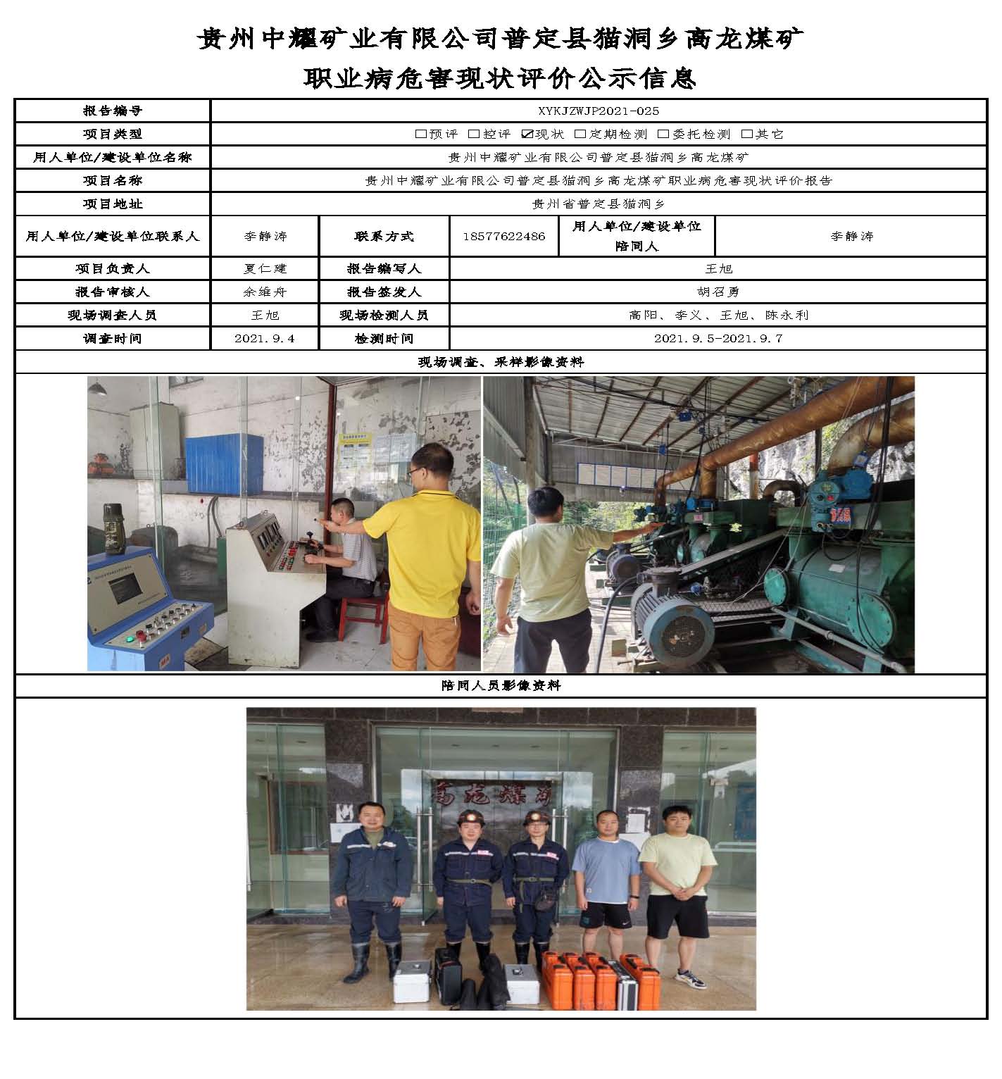 貴州中耀礦業(yè)有限公司普定縣貓洞鄉(xiāng)高龍煤礦 職業(yè)病危害現(xiàn)狀評(píng)價(jià)公示信息
