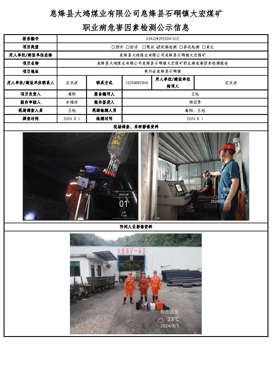 息烽縣大鴻煤業(yè)有限公司息烽縣石硐鎮(zhèn)大宏煤礦職業(yè)病危害因素檢測(cè)公示信息
