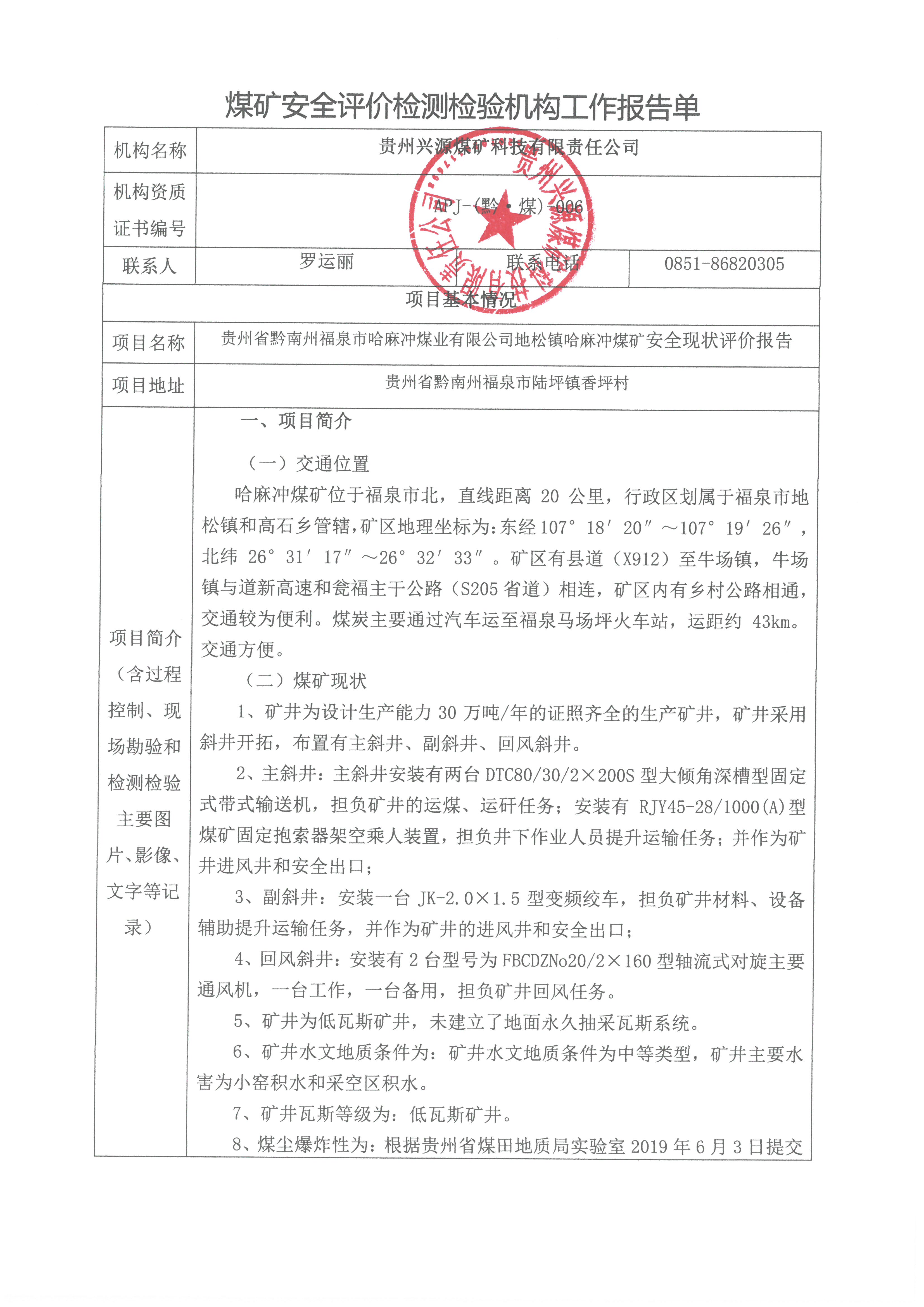 煤礦安全評價檢測檢驗機構工作報告單【貴州省黔南州福泉市哈麻沖煤業(yè)有限公司地松鎮(zhèn)哈麻沖煤礦安全現狀評價報告】