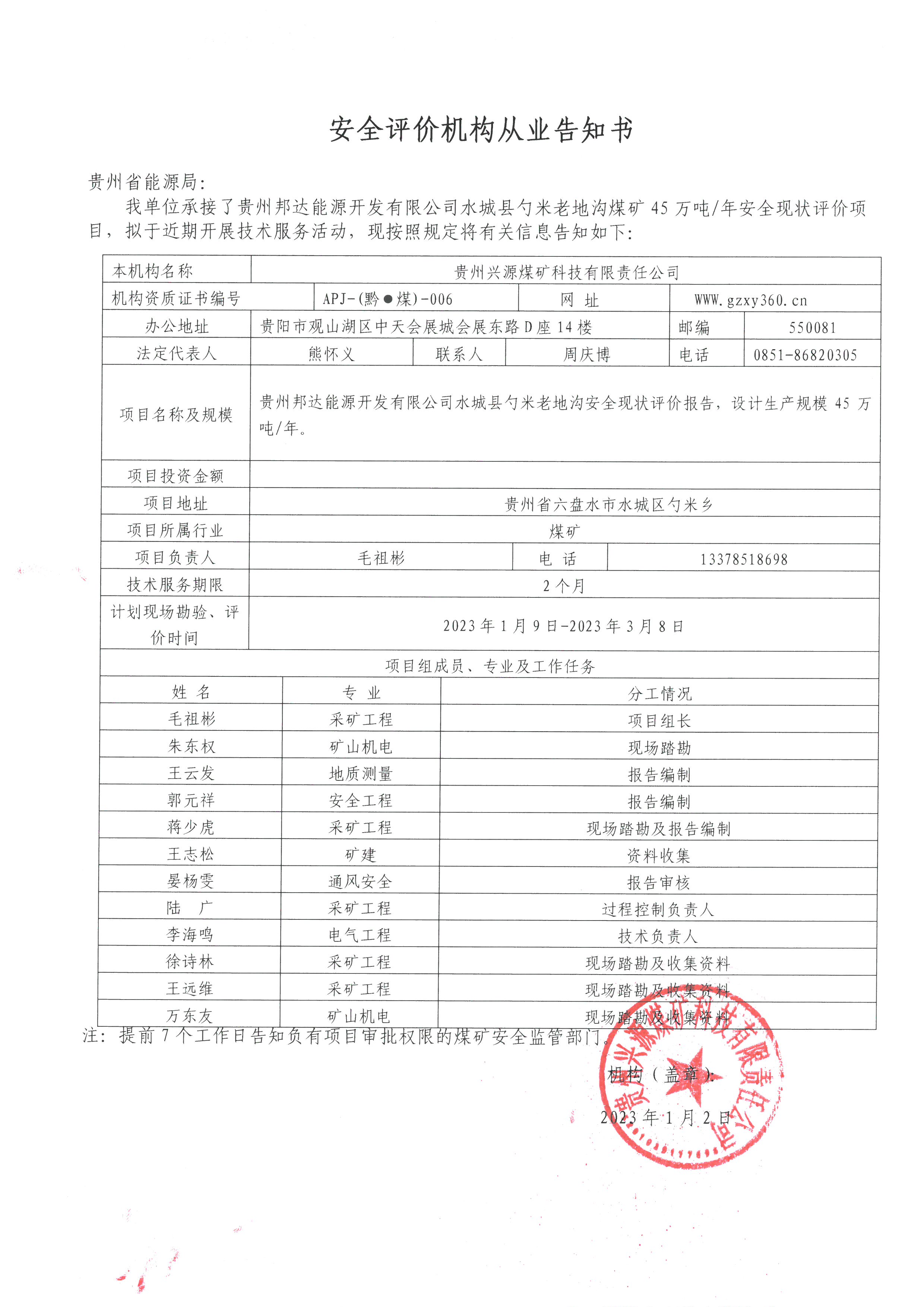 安全評(píng)價(jià)機(jī)構(gòu)從業(yè)告知書【貴州邦達(dá)能源開發(fā)有限公司水城縣勺米老地溝煤礦】