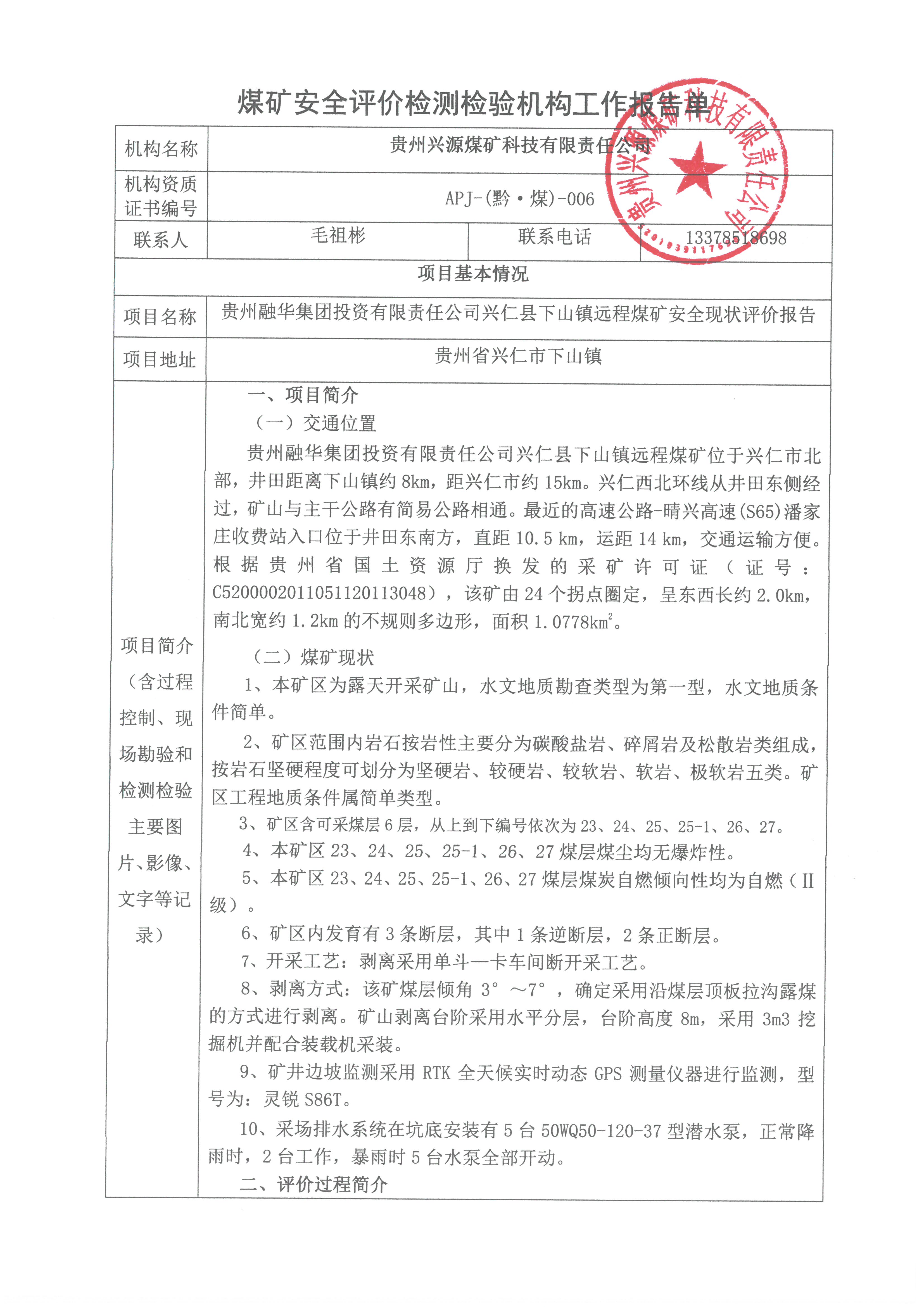 煤礦安全評價(jià)檢測檢驗(yàn)機(jī)構(gòu)工作報(bào)告單【貴州融華集團(tuán)投資有限責(zé)任公司興仁縣下山鎮(zhèn)遠(yuǎn)程煤礦安全現(xiàn)狀評價(jià)報(bào)告】