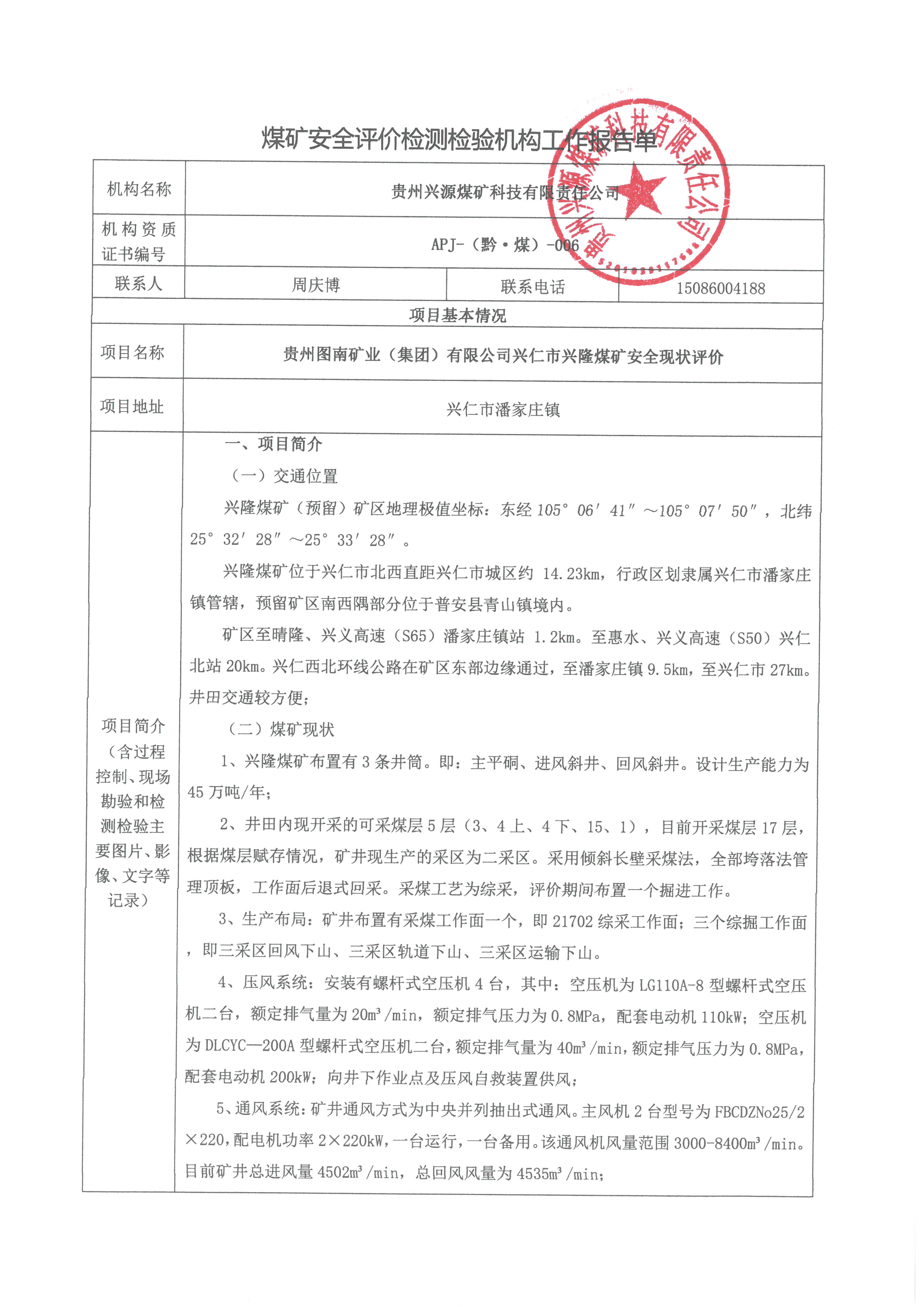 煤礦安全評價(jià)檢測檢驗(yàn)機(jī)構(gòu)工作報(bào)告單【貴州圖南礦業(yè)(集團(tuán))有限公司興仁市興隆煤礦安全現(xiàn)狀評價(jià)】