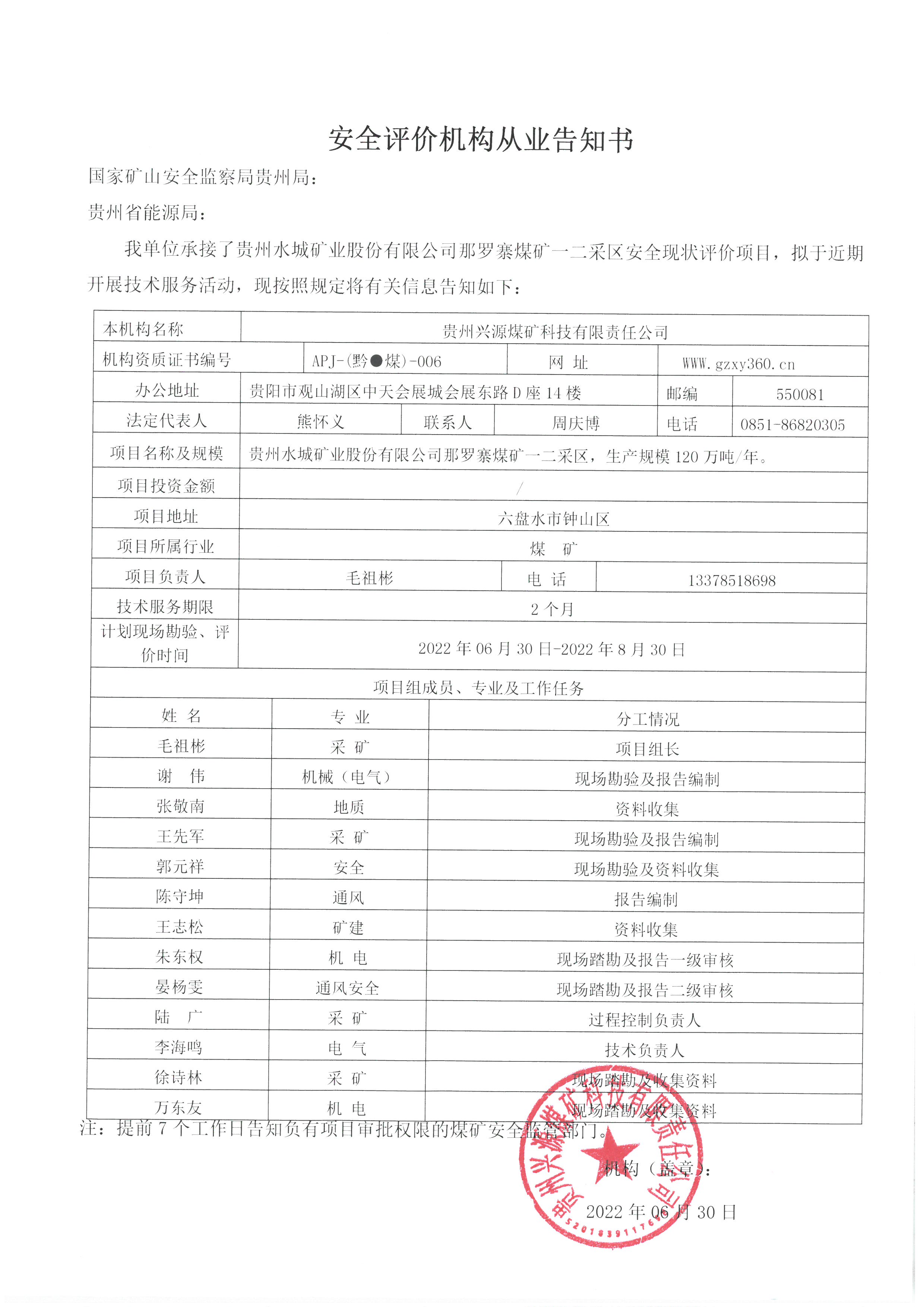 安全評價機(jī)構(gòu)從業(yè)告知書【貴州水城礦業(yè)股份有限公司那羅寨煤礦】