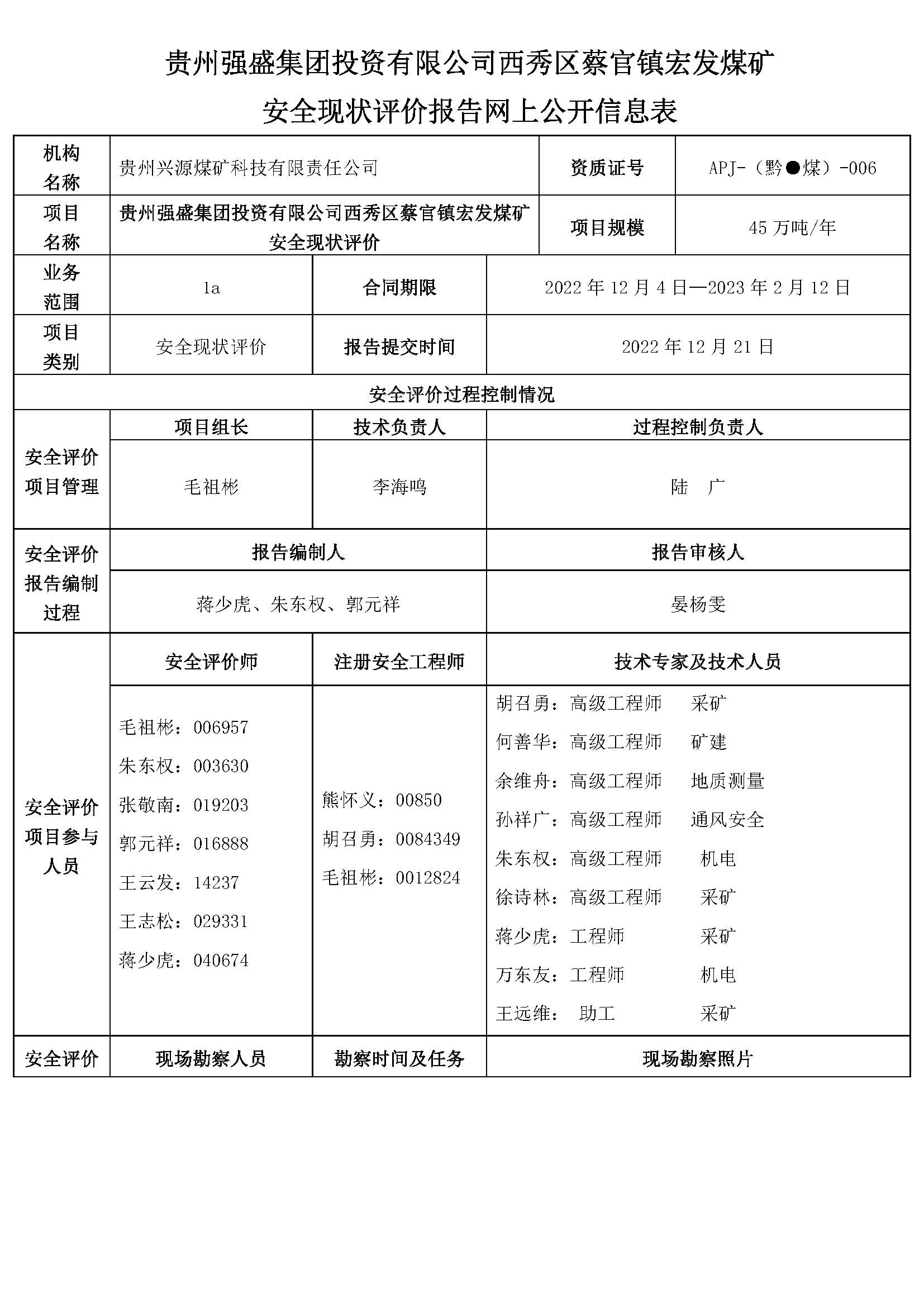貴州強(qiáng)盛集團(tuán)投資有限公司西秀區(qū)蔡官鎮(zhèn)宏發(fā)煤礦安全現(xiàn)狀評價報告網(wǎng)上公開信息表
