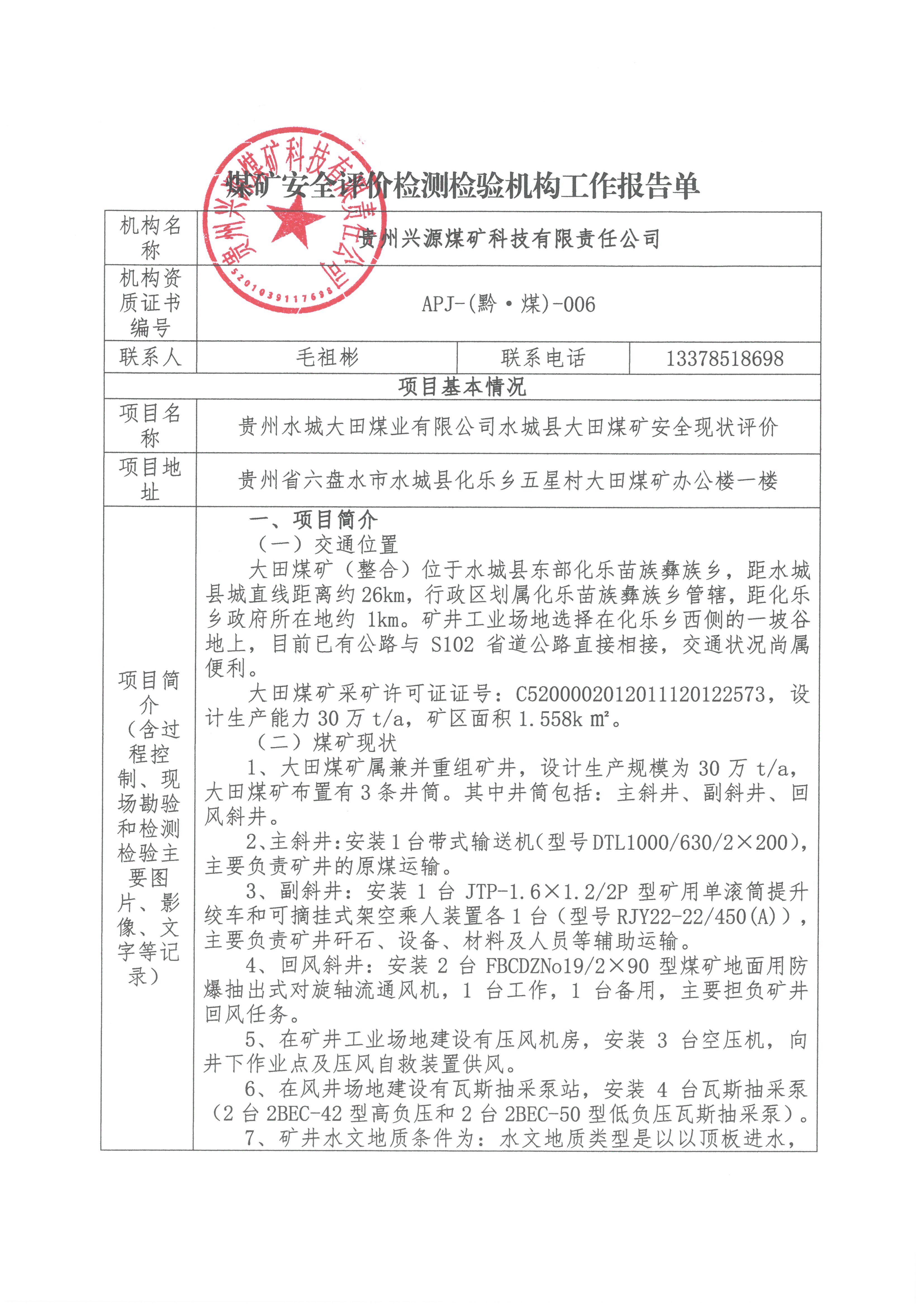 煤礦安全評(píng)價(jià)檢測(cè)檢驗(yàn)機(jī)構(gòu)工作報(bào)告單【貴州水城大田煤業(yè)有限公司水城縣大田煤礦安全現(xiàn)狀評(píng)價(jià)】