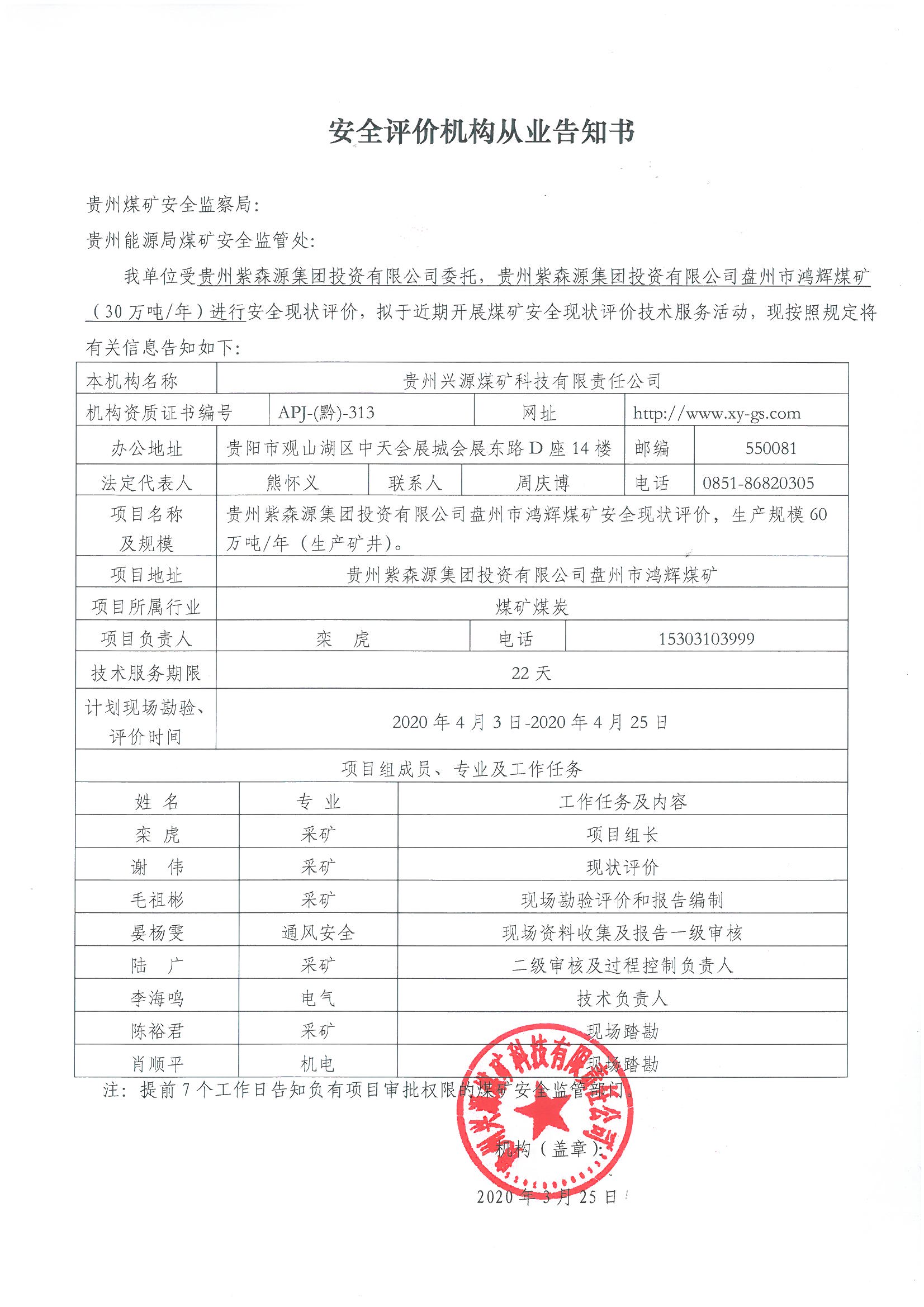 安全評價(jià)機(jī)構(gòu)從業(yè)告知書(貴州紫森源集團(tuán)投資有限公司鴻輝煤礦)