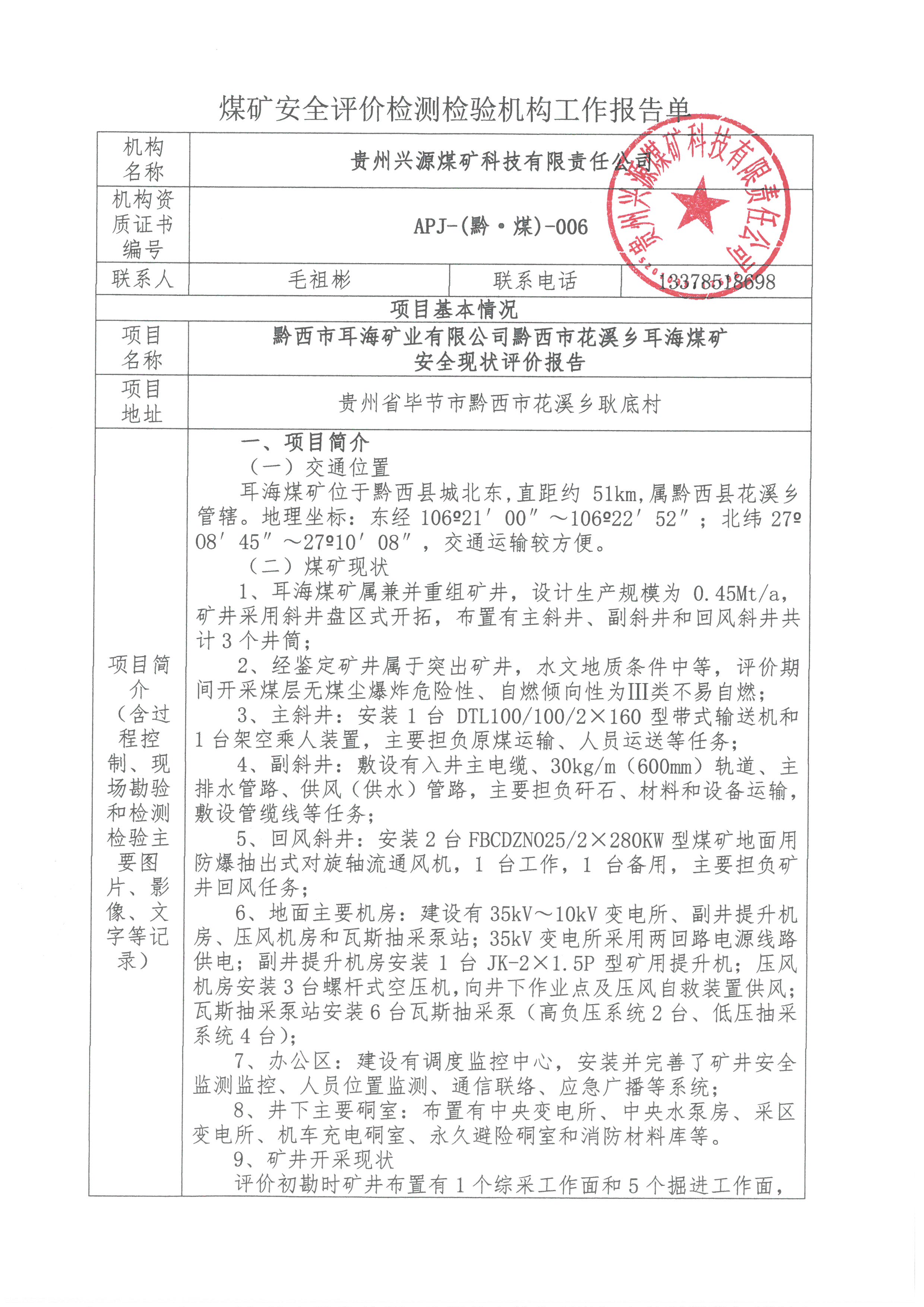 煤礦安全評價(jià)檢測檢驗(yàn)機(jī)構(gòu)工作報(bào)告單【黔西市耳海礦業(yè)有限公司黔西市花溪鄉(xiāng)耳海煤礦安全現(xiàn)狀評價(jià)報(bào)告】
