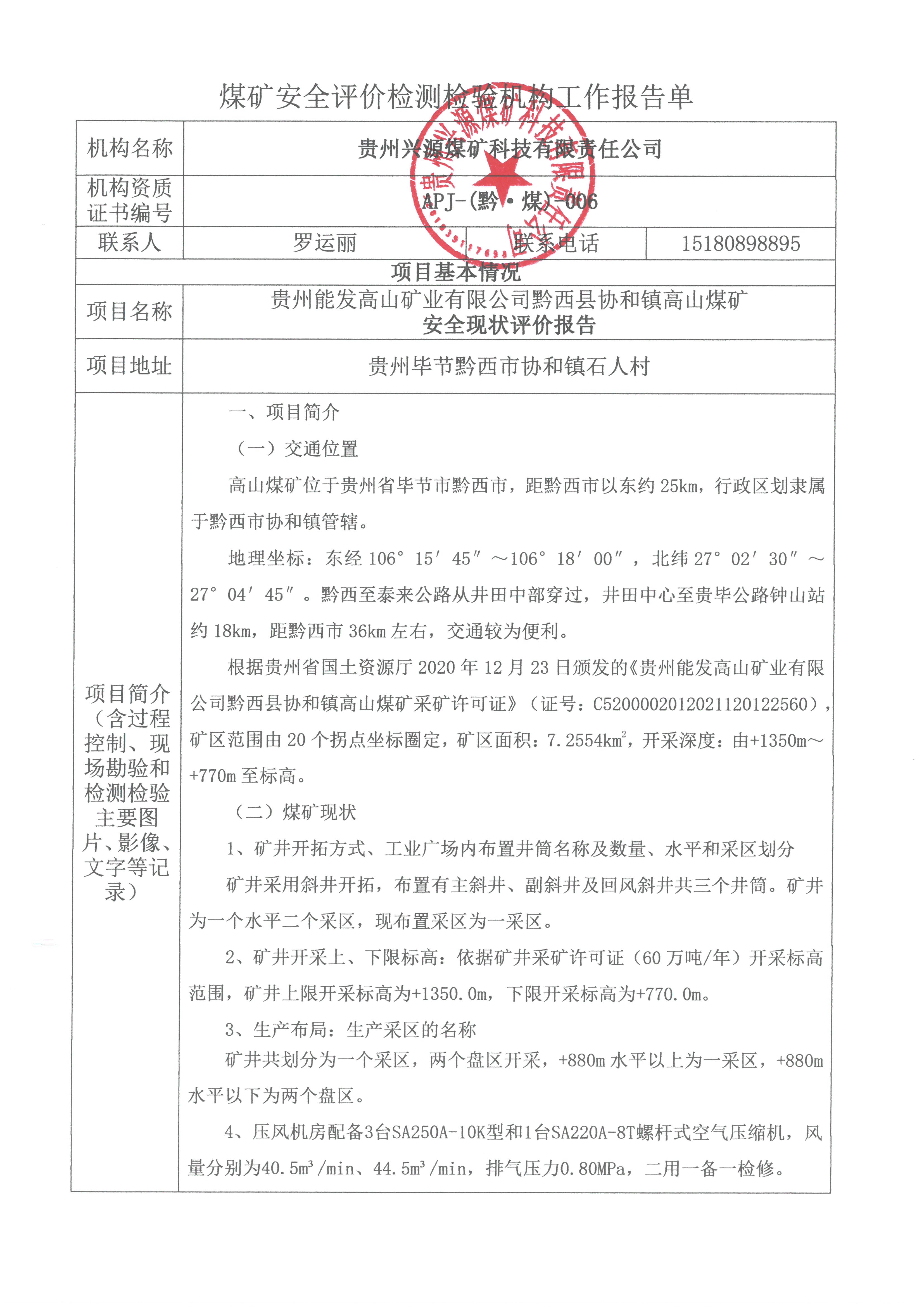 貴州能發(fā)高山礦業(yè)有限公司黔西縣協(xié)和鎮(zhèn)高山煤礦 安全現(xiàn)狀評價(jià)報(bào)告