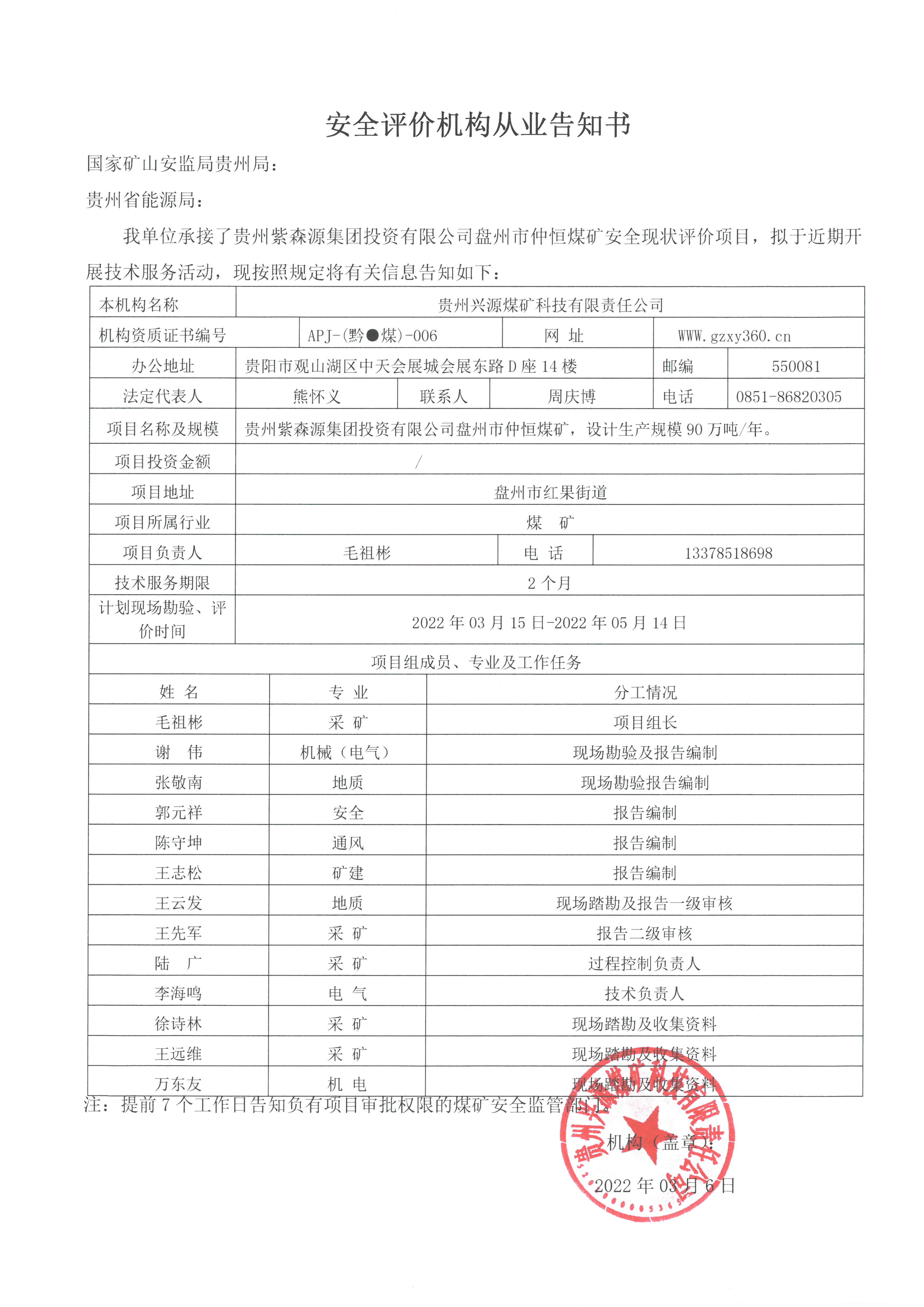 安全評價機(jī)構(gòu)從業(yè)告知書(貴州紫森源集團(tuán)投資有限公司盤州市仲恒煤礦安全現(xiàn)狀評價)