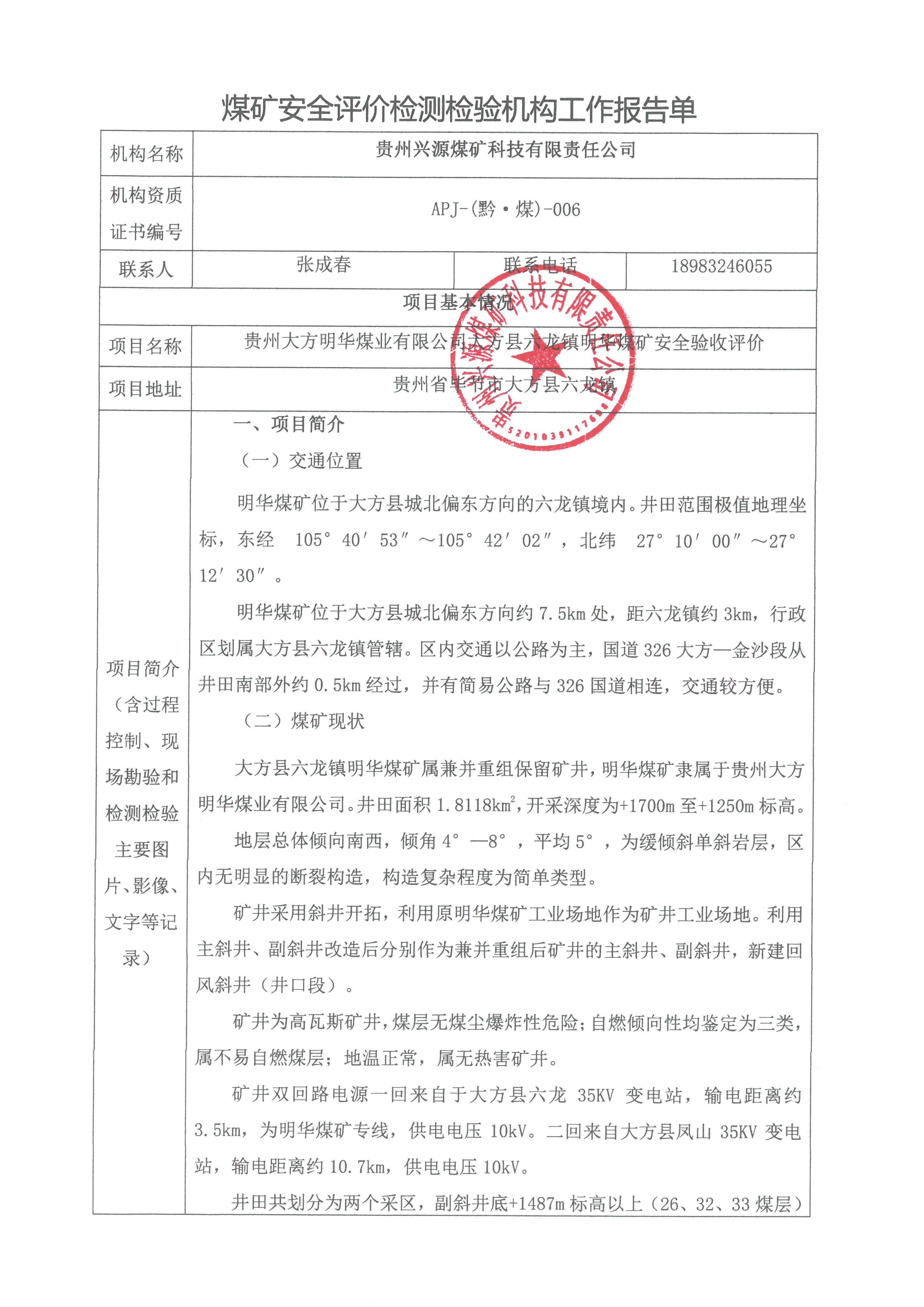 煤礦安全評價檢測檢驗機(jī)構(gòu)工作報告單【貴州大方明華煤業(yè)有限公司大方縣六龍鎮(zhèn)明華煤礦安全驗收評價】