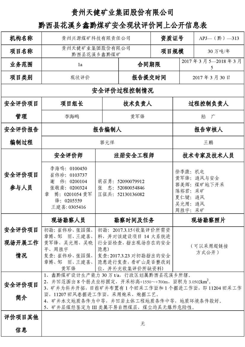 貴州天健礦業(yè)集團股份有限公司黔西縣花溪鄉(xiāng)鑫黔煤礦安全現(xiàn)狀評價網(wǎng)上公開信息表