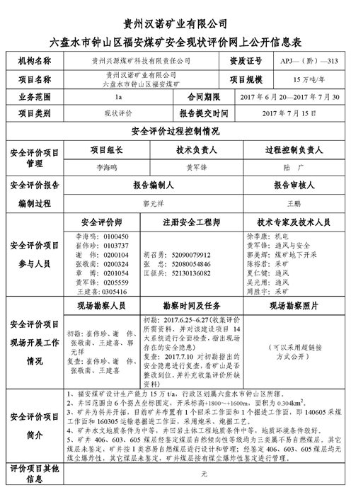 貴州漢諾礦業(yè)有限公司六盤水市鐘山區(qū)福安煤礦安全現(xiàn)狀評價網(wǎng)上公開信息表