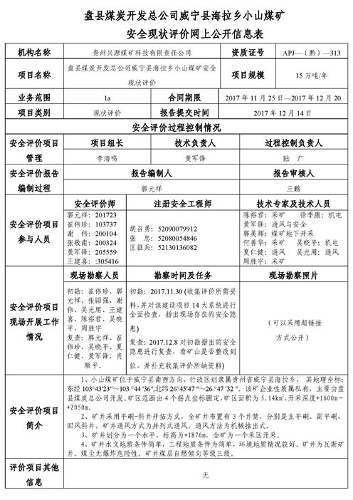 盤縣煤炭開發(fā)總公司威寧縣海拉鄉(xiāng)小山煤礦安全現(xiàn)狀評價網(wǎng)上公開信息表