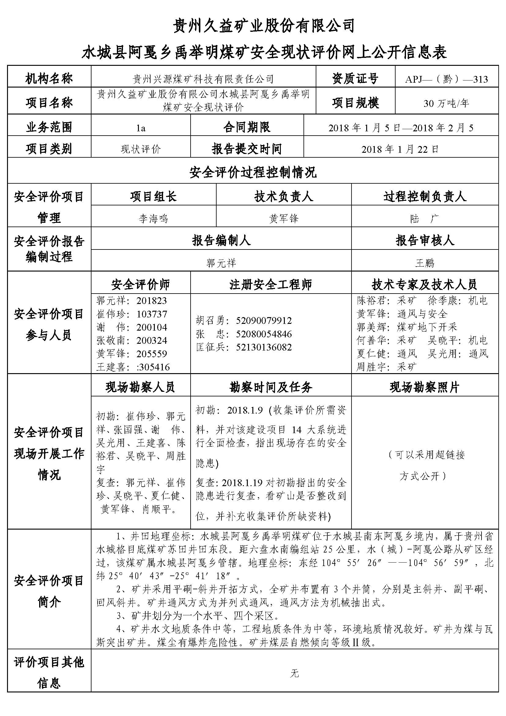貴州久益礦業(yè)股份有限公司水城縣阿戛鄉(xiāng)禹舉明煤礦安全現(xiàn)狀評(píng)價(jià)網(wǎng)上公開信息表