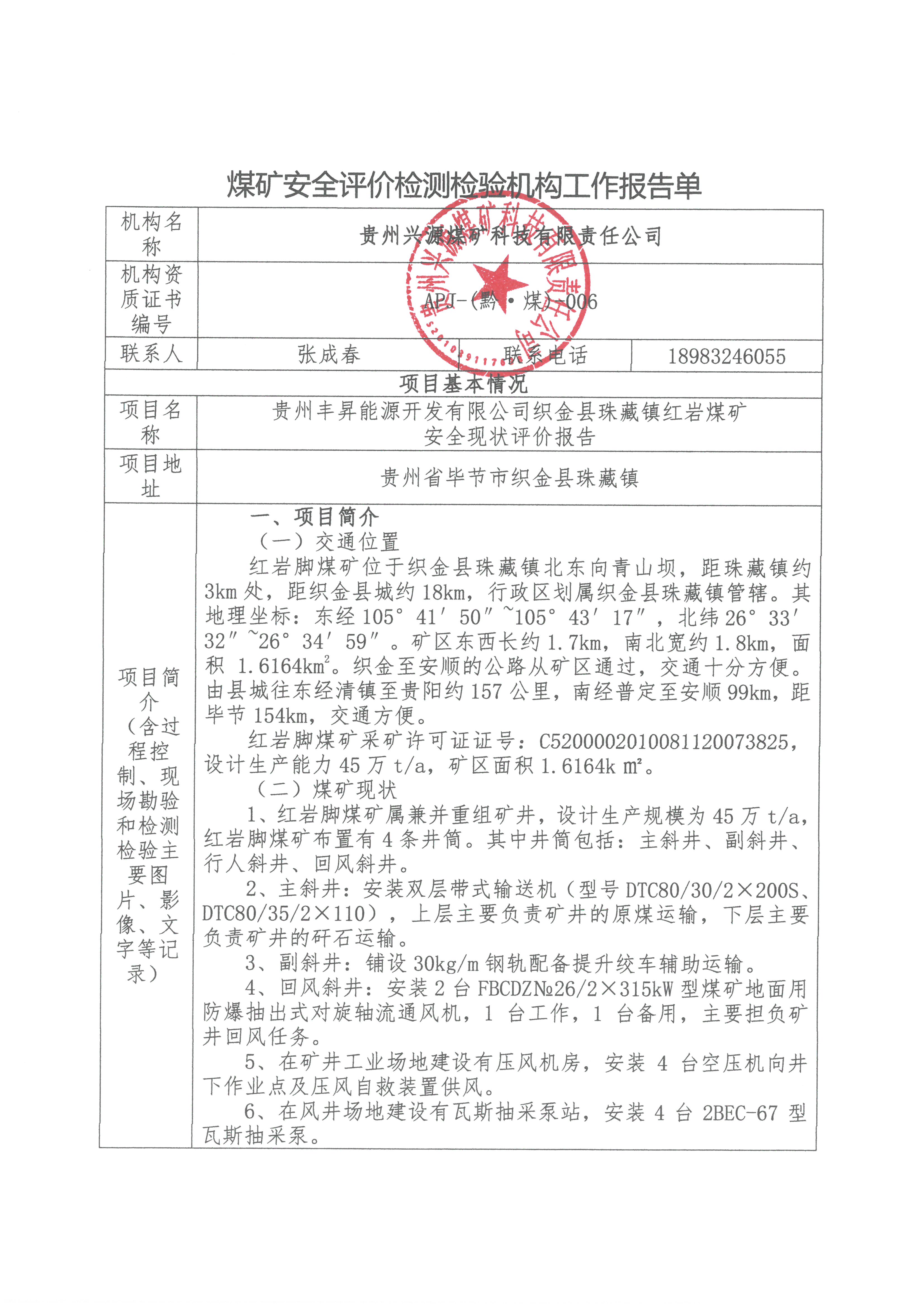 煤礦安全評價檢測檢驗機構工作報告單【貴州豐昇能源開發(fā)有限公司織金縣珠藏鎮(zhèn)紅巖煤礦安全現狀評價報告】